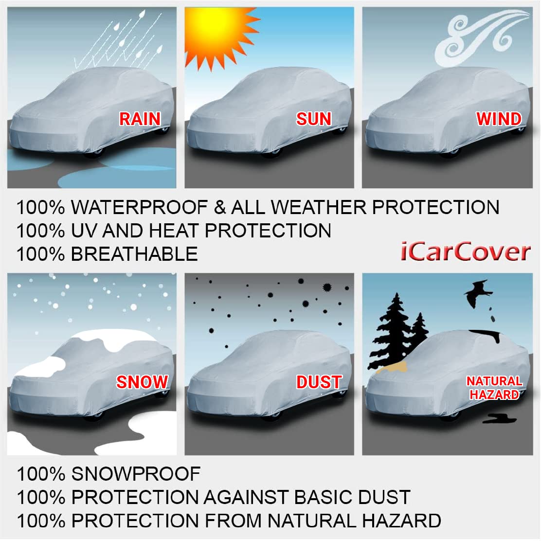 Keep Your Car Clean & Dry Against All Weather? Icarcover Full Car Cover Protects Your Car Against All Weather And Elements Year-Round.? Perfect For Any Car Owner Who Doesnt Want To Keep Cleaning Their Car Every Morning.Reliable Protection? Against Hot Sun, Heavy Rain, Strong Wind, Snow & Sand.Keep Your Car Running Smoothly? Waterproof And Windproof Car Cover Stops Dust From Getting In Car & Mechanical Parts.? Keeping Car Clean So You Dont Have To Fear The Weather. Easy Use | Portable Storage Bag Included? Easy Set-Up, Storage, And Removal For Quick On The Go Use. Easy Cleaning & Maintenance? To Clean Car Cover Simply Wipe With Damp Cloth And It Will Be Ready For Use Again.Make The Smart Choice? To Keep Your Car Clean & Safe Year-Round With Icarcover!=======================.Package Include: ? 1 X Car Cover?1 X Zipped Storage Bag? 2 X Antenna Patches? 1X Pair Grommet? 3 X Windproof Straps Front, Middle, Rear? 1 X Instructions.