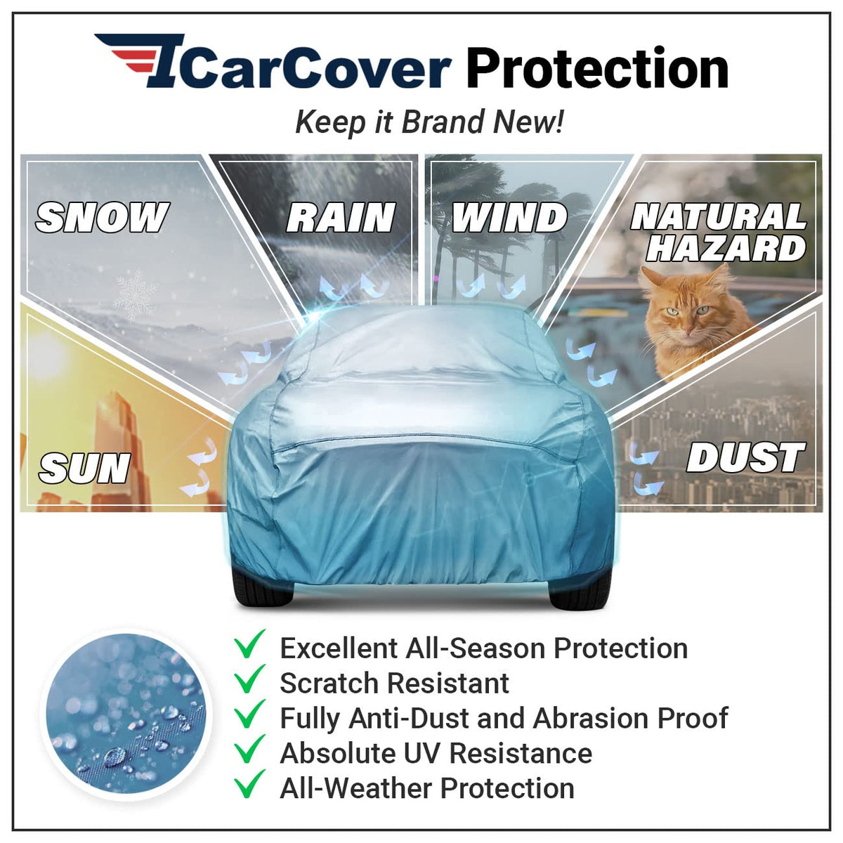 Keep Your Car Clean & Dry Against All Weather? Icarcover Full Car Cover Protects Your Car Against All Weather And Elements Year-Round.? Perfect For Any Car Owner Who Doesnt Want To Keep Cleaning Their Car Every Morning.Reliable Protection? Against Hot Sun, Heavy Rain, Strong Wind, Snow & Sand.Keep Your Car Running Smoothly? Waterproof And Windproof Car Cover Stops Dust From Getting In Car & Mechanical Parts.? Keeping Car Clean So You Dont Have To Fear The Weather. Easy Use | Portable Storage Bag Included? Easy Set-Up, Storage, And Removal For Quick On The Go Use. Easy Cleaning & Maintenance? To Clean Car Cover Simply Wipe With Damp Cloth And It Will Be Ready For Use Again.Make The Smart Choice? To Keep Your Car Clean & Safe Year-Round With Icarcover!=======================.Package Include: ? 1 X Car Cover?1 X Zipped Storage Bag? 2 X Antenna Patches? 1X Pair Grommet? 3 X Windproof Straps Front, Middle, Rear? 1 X Instructions.=======================.Please Check Compatibility Tools & Dimensions Information Before Purchase