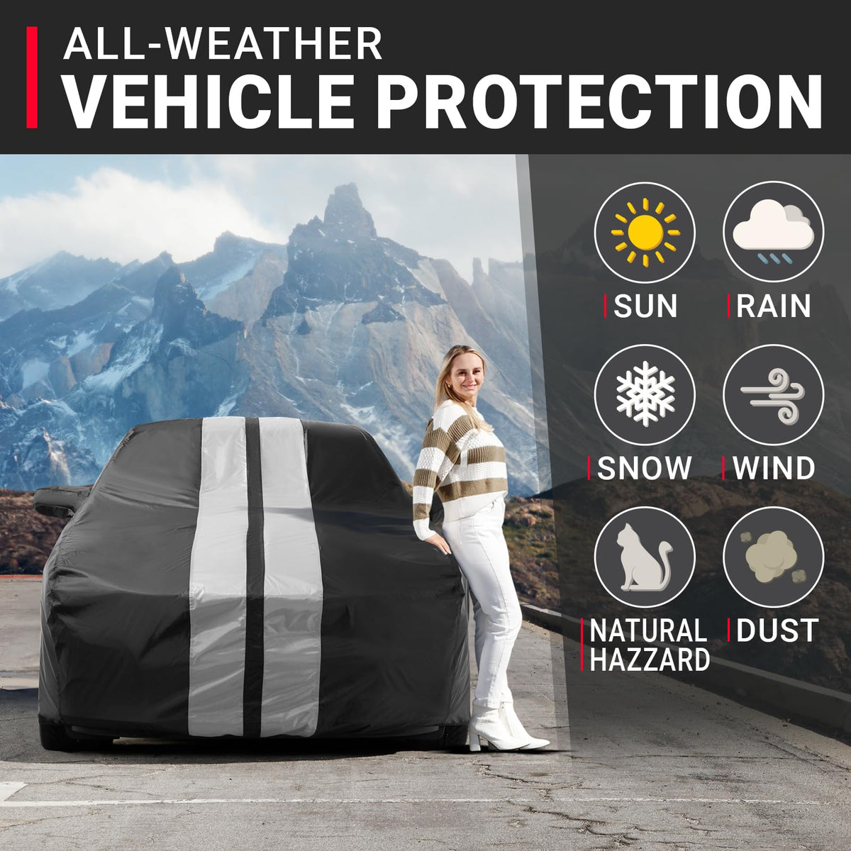 Keep Your Car Clean & Dry Against All Weather? iCarCover Full Car Cover protects your car against all weather and elements year-round.? Perfect for any car owner who doesnt want to keep cleaning their car every morning.Reliable Protection? Against Hot Sun, Heavy Rain, Strong Wind, Snow & Sand.Keep Your Car Running Smoothly? Waterproof and Windproof Car Cover stops dust from getting in Car & Mechanical parts.? Keeping car clean so you dont have to fear the weather. Easy Use | Portable Storage Bag Included? Easy set-up, storage, and removal for quick on the go use. Easy Cleaning & Maintenance? To clean Car Cover simply wipe with damp cloth and it will be ready for use again.Make the Smart Choice? To Keep Your Car Clean & Safe Year-Round with iCarCover!=======================.Package Include: ? 1 x Car cover?1 x Zipped Storage Bag? 2 x Antenna Patches? 1x Pair Grommet? 3 x Windproof Straps Front, Middle, Rear? 1 x Instructions.=======================.Please check Compatibility Tools & Dimensions Information before PURCHASE
