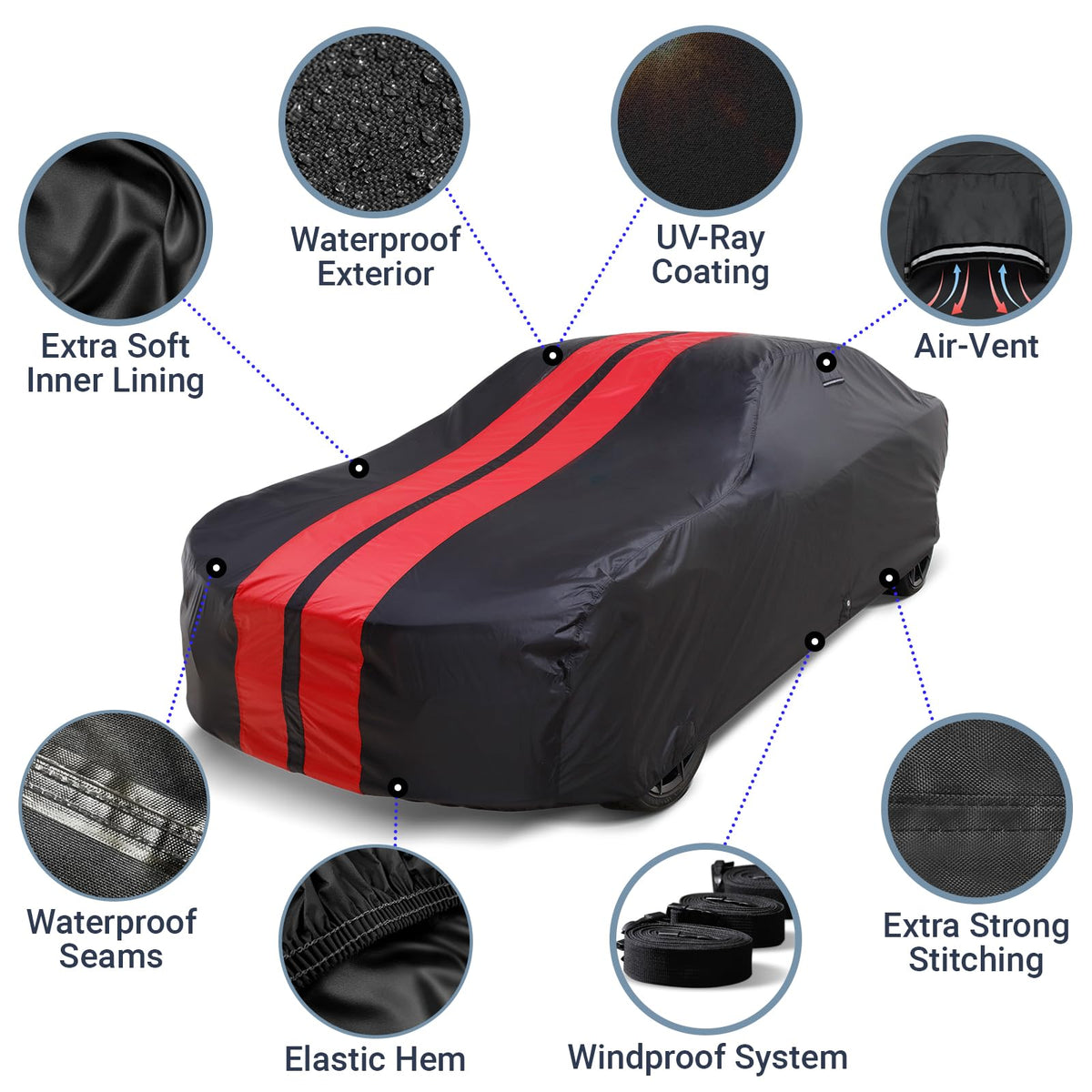 All-Weather Assurance: Our weatherproof car cover shields your vehicle from the harshest elements, offering protection year-round. Rain, sun, snow, or hail - our car cover has you covered. Snow and Wind Resilience: Equipped with sturdy straps and elastic edges, our car snow cover ensures your vehicle remains securely shielded in winter conditions, whether it 's a classic or modern model. Premium Outdoor Fabric: Unlike basic car tarps, our outdoor car cover is crafted from top-tier waterproof material, designed to repel water and prevent scratches, keeping your car 's exterior pristine. Versatile Fit: Ideal for sedans and coupes, our car cover is a spacious, universal solution, suitable for both indoor and outdoor use, offering comprehensive protection. UV Radiation Shield: Our car cover provides premium sun protection, preserving your vehicle 's interior from excessive heat and thwarting fading due to sun exposure. Effortless Application: This portable car cover slips on and off with ease, offering convenience without compromising on protection. Robust and Durable: Our thick car cover provides an extra layer of defense against environmental hazards. Anti-Snow and Ice: Our car cover prevents snow and ice buildup on your vehicle. Cotton Lining: The interior features a plush cotton lining to protect your car 's finish. Complete Vehicle Coverage: Enjoy full protection for every inch of your vehicle, inside and out. Defender 's Strength: Our car cover shields your vehicle like a steadfast defender, safeguarding it from harm. Tailored Fit and Lifetime Durability: This car cover is meticulously tailored for a lifetime of steadfast protection. Feather-Light Design: It boasts a lightweight design for effortless handling. Top-Rated Choice: Our car cover has been rated as the best in its category by highly satisfied customers.