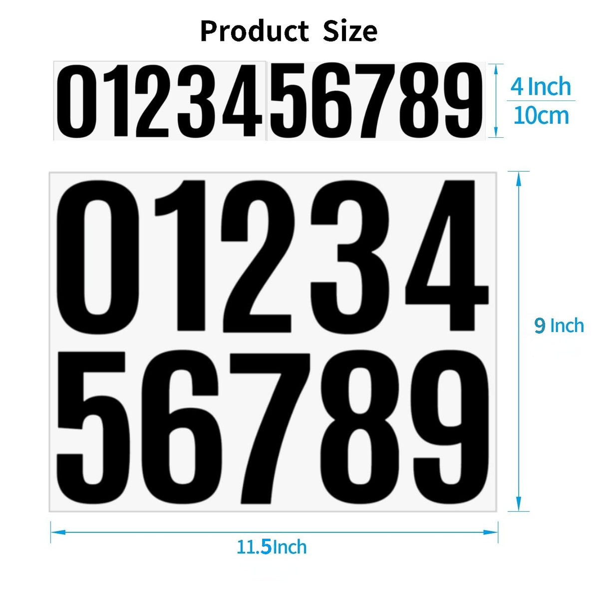 Q: How many vinyl number stickers are included in the package?A: The package includes 10 sets of self-adhesive vinyl number stickers, with each set containing 10 numbers (0 to 9), totaling 100 pieces.