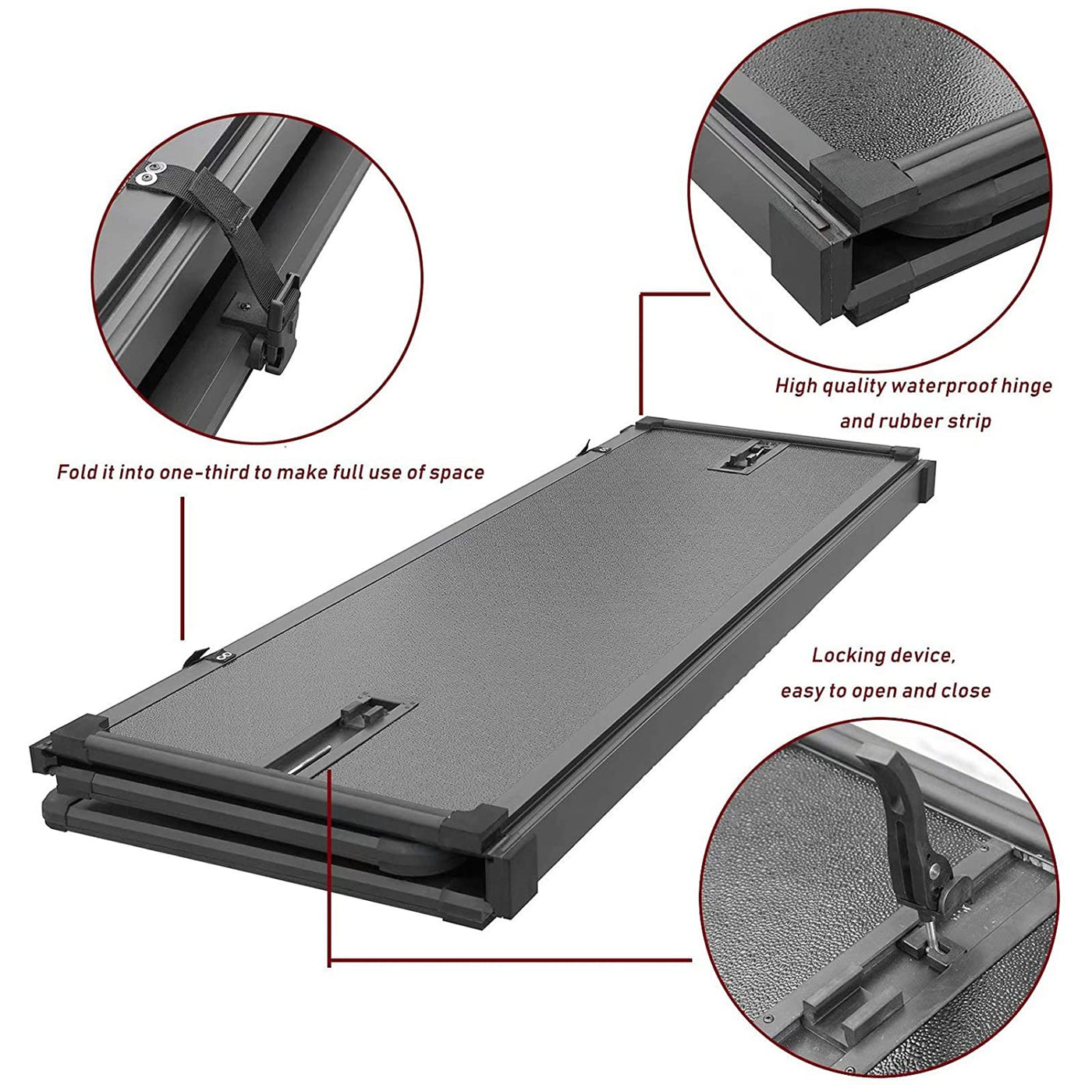 Glass fiber reinforced polymer (FRP) provides high impact resistance and better scratch resistance compared to aluminum or glass. It stays cooler in hot environments and has a superior impact resistance of about 20KJ/m. The polypropylene (PP) honeycomb core reduces weight while increasing load-bearing strength to support up to 350 pounds. The thin design maximizes under-bed storage. It features a waterproof sealed hinge system tested for water, snow, and dust resistance. Electrophoretic treatment enhances hardware durability. The black textured spray-coated aluminum offers UV protection. Easy installation without drilling; fold and lift for full truck bed usage. Lightweight for easy removal and reinstallation. Spring clamps for convenient locking and releasing. Cover splits into three sections for storage. Provides security with LED touch lights and rubber seals. The new design with hard polymer rubber parts is the most waterproof on the market. Includes a 3-year warranty.