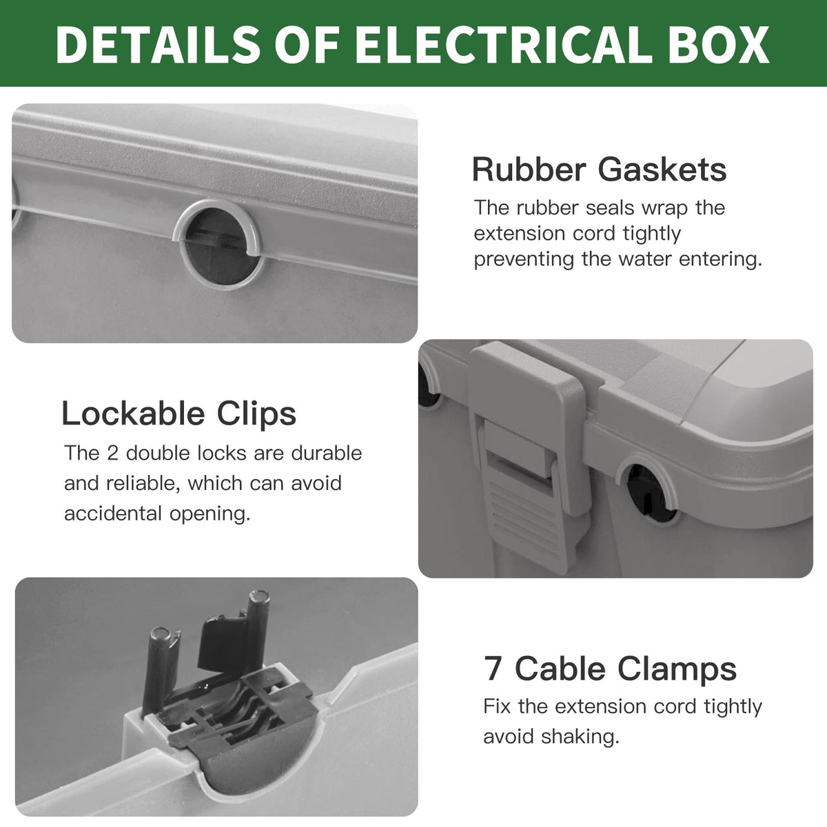 Q: What materials is the electrical box made of and how durable is it?A: The electrical box is constructed from heavy-duty reinforced polypropylene (PP) material, which provides resistance against external damage, shocks, drops, and extreme weather conditions like heavy rain and snow.