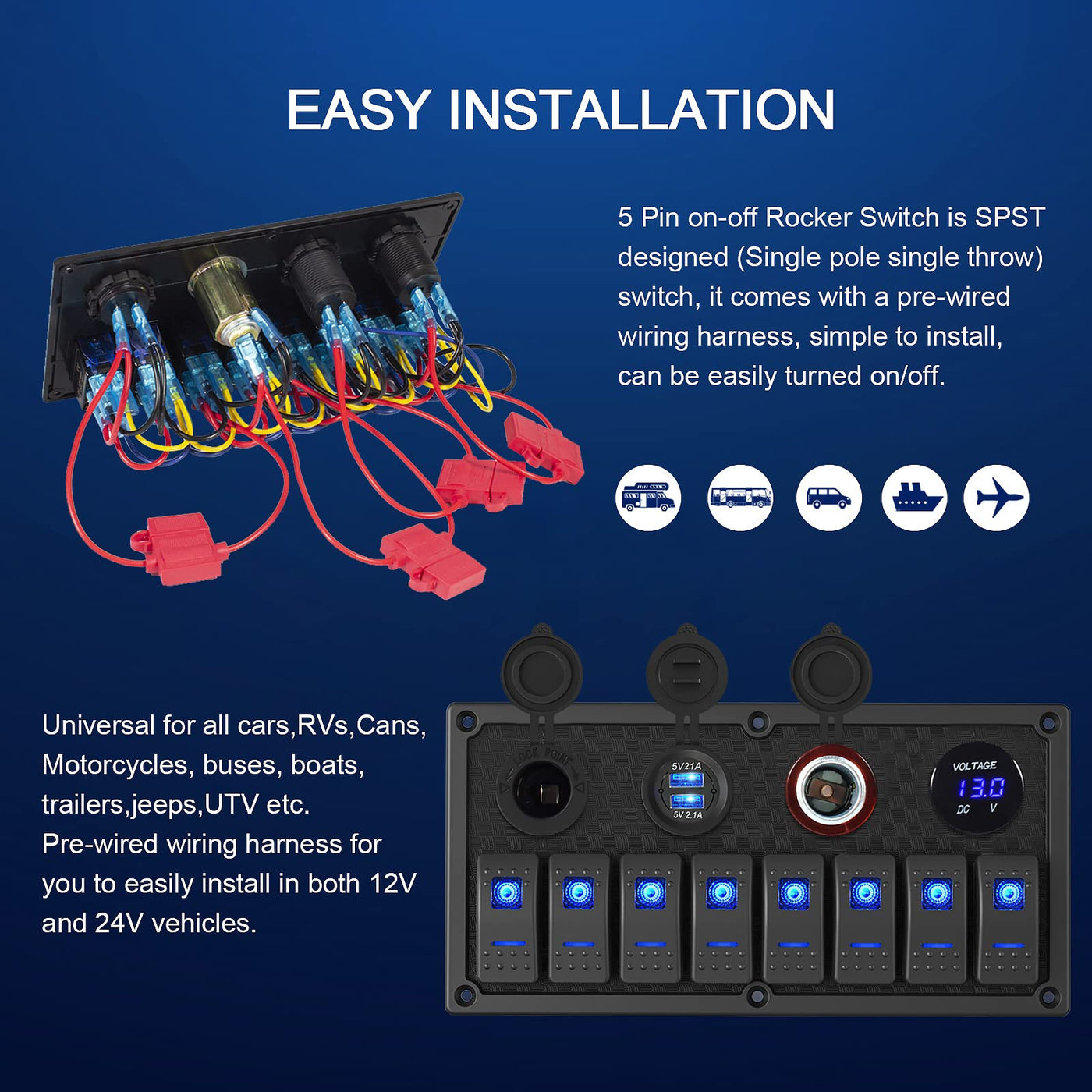 Marine Switch Panel,8 Gang Waterproof Rocker Switch Panel,Multi Function Dual USB Slot Socket with Digital Voltmeter,12-24V Pre-