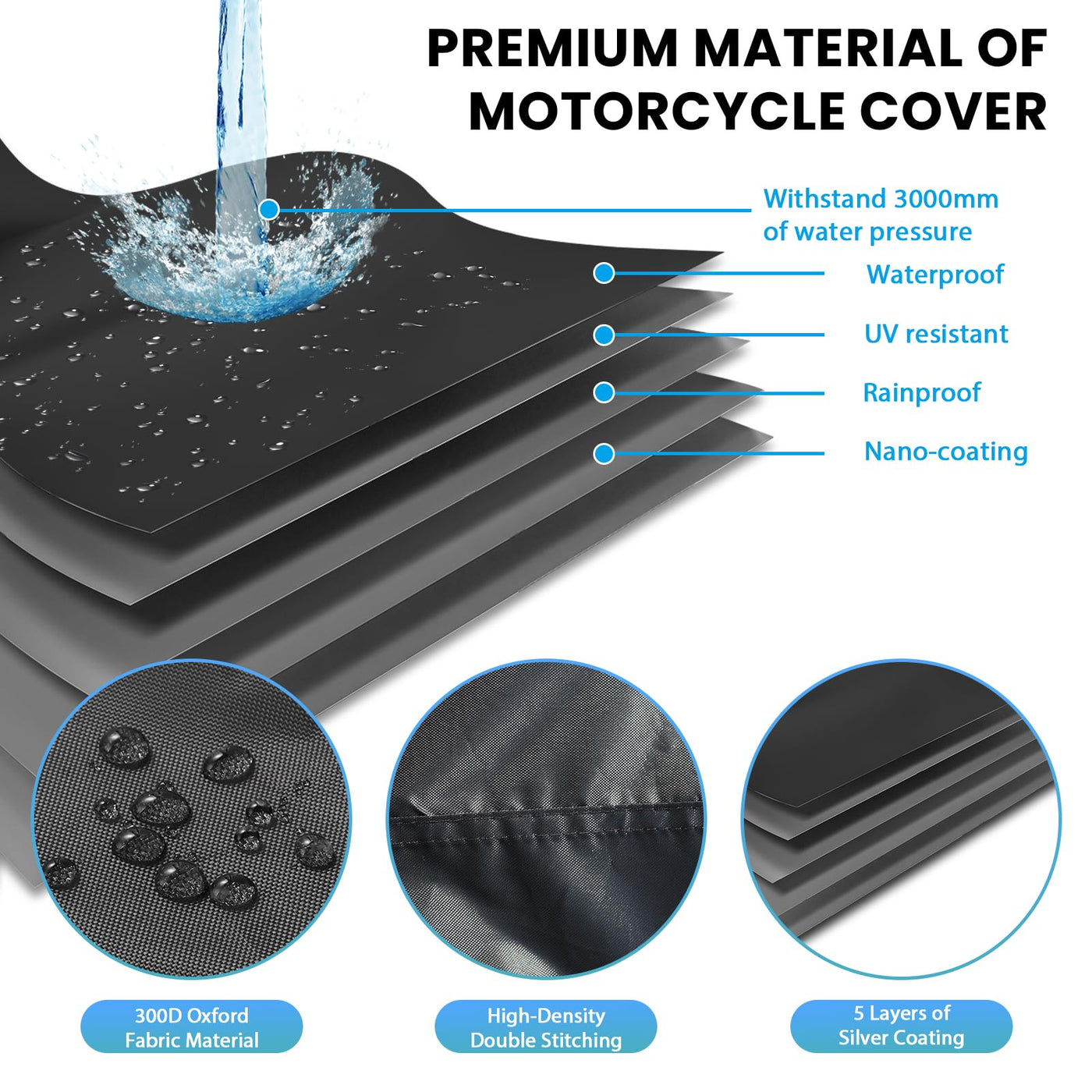 Functional Details: ? 4 Reflective strips on the left and right sides of the front and back to improve safety at night; ? 1 reflective carrying handle for easy lifting and folding; ? 2 fixed buckles at the bottom, and 1 of which is movable buckle and windproof; ? 4 locking holes can be combined with motorbike lock to secure the front and back; ? 300D oxford outer and silver coated lining for sun protection and waterproof. | 300D Waterproof Material: The motorcycle cover is made of 300D Oxford waterproof fabric with silver coated lining, combined with double stitching and internal waterproof strips, it's more smooth and waterproof, which can protect your bike from wind and rain as well as from UV rays, dust, falling leaves or other natural weather. PLEASE NOTE: Please don't use sharp decorations or car mirrors against the seams, easy to tear. Try to keep it indoors before a storm as a way to increase its lifespan. | 5 Reflective Strips Design: The waterproof motorcycle cover comes with 4 orange reflective strips on front and back, and improve safety at night to prevent collision. There is also 1 orange reflective carrying handle on top, easy to lift up and down, distinguish the sign in front, easy to install. PLEASE NOTE: Please measure the length, width and height of your bike first and reserve the length 4 inches/10 cm on this dimension. | Windproof Design: The motorbike cover with 2 symmetrical locking holes (locks not included), can combination with the 2 buckle straps at the bottom, 1 is fixed in the middle of the bottom and can't be moved, and the other movable wind-proof buckle strap can be combined with the locks to secure the hood front and back. PLEASE NOTE: Please do not discard the movable buckle straps during installation or storage, there is no replacement or retrieval if you lose this accessory. | Universal Size: The size of our motorcycle cover is L- 205 x 95 x 110 cm/80.7 x 37.4 x 43.3 inch (LxWxH), fit for most motorcycles, scooters, mopeds, sportbikes, cruisers, dirt bikes and so on. With motorcycle cover, you can have an easy garage. PLEASE NOTE: ? In hot or stormy climate, it is more recommended to put it indoor for the safety of your motorcycle. ? Please actually measure the length, width and height of your car before purchasing in order to choose a more suitable size.