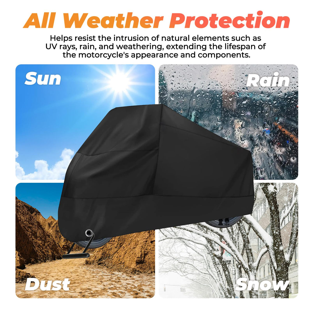 Q: What kind of protection does the Motorcycle Cover Heavy Duty Waterproof provide?A: The Motorcycle Cover Heavy Duty Waterproof offers comprehensive protection against sunlight, rain, dust, and weathering. Its UV50+ protection reduces color fading and surface aging, while the waterproof Oxford fabric ensures your motorcycle stays dry and shielded from the elements.