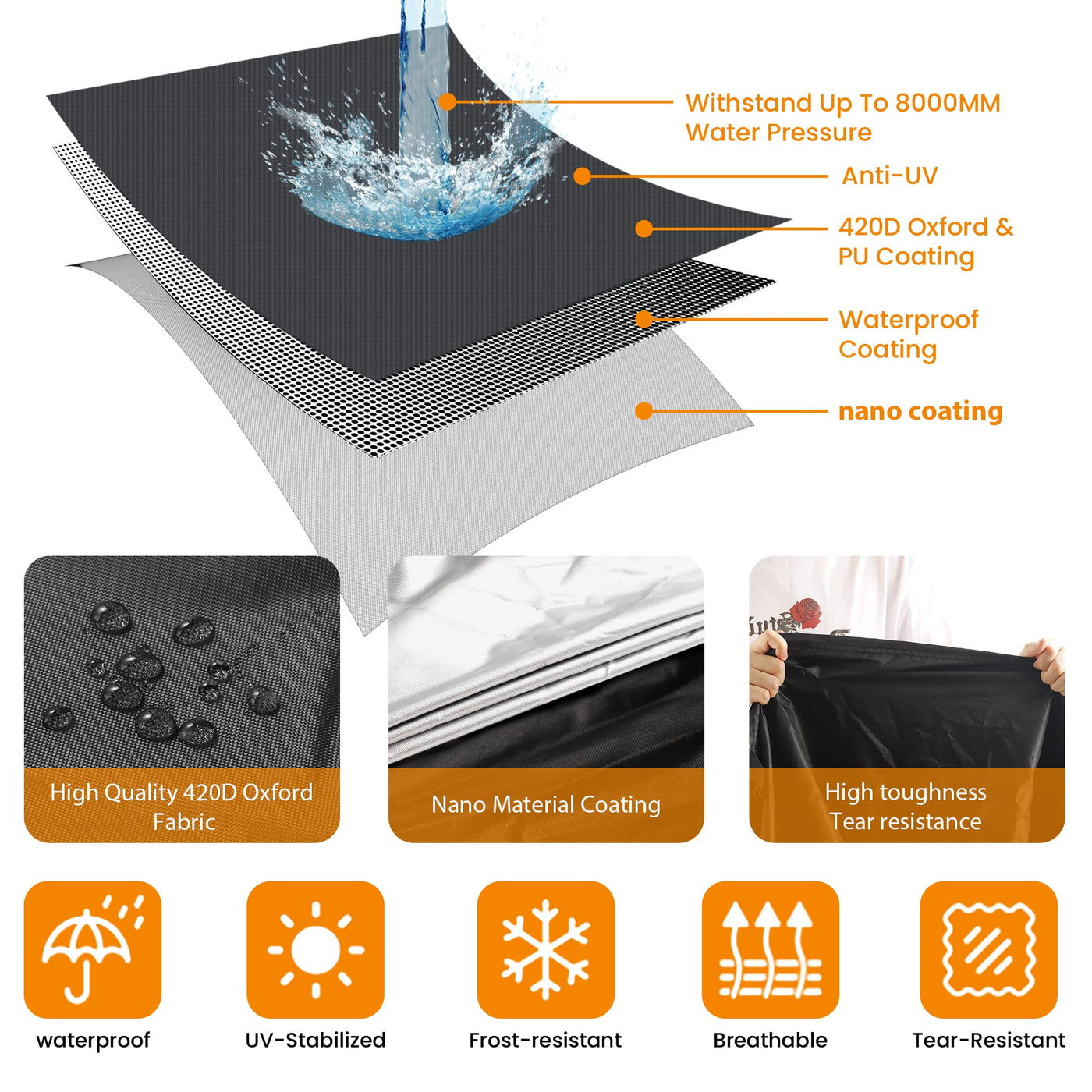 Q: Is the motorcycle cover waterproof?A: Yes, the motorcycle cover features waterproof strips added at the seams and boasts double-stitched seams, allowing it to withstand up to 8000MM of water pressure, making it highly effective in protecting your motorcycle from rain and harsh weather conditions.
