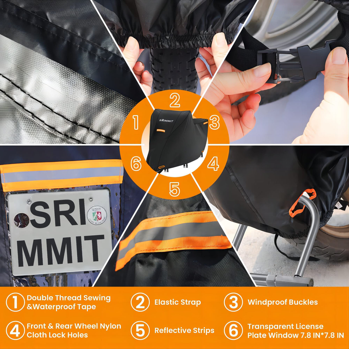 Srimmit Motorcycle Cover Is Made Of 420D Premium Quality Oxford Fabric. The Double Stitching And Added Waterproof Strips Make It Very Durable Even In Harsh Weather. Full Elastic Hem To Fit Your Motorcycle. Design With 3 Windproof Buckles At The Bottom Which Help Lock Your Motorbike, Makes The Motorcycle Cover Very Secure Even In Heavy Winds. With A Transparent License Plate Window For Easy Identification Of Your Motorcycle And No More Paying Unnecessary Fines.With 4 High Visibility Reflective Strips, You Can Clearly See The Location Of The Vehicle In The Evening And Prevent Collision. Equipped With 2 Lock Holes, In Locking The Motorcycle Can Play The Role Of Anti Theft.