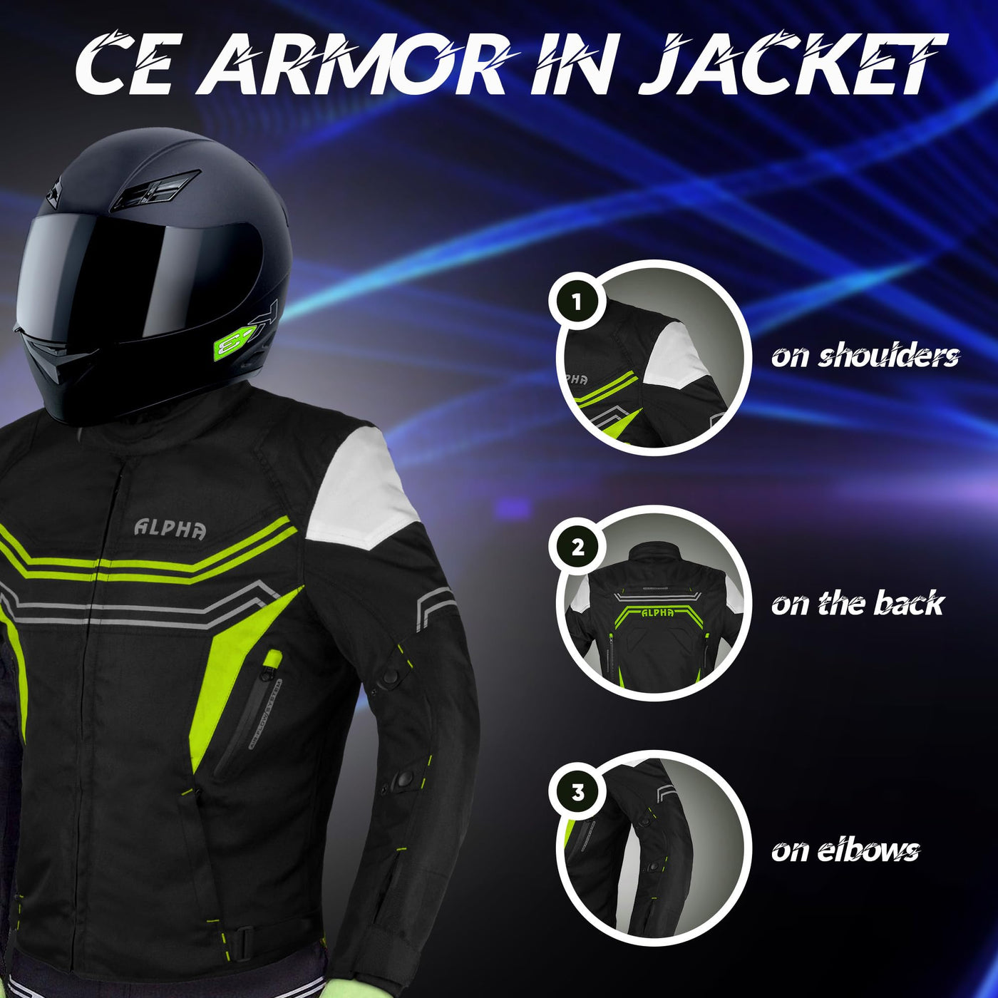Q: What type of armor does the jacket include for protection?A: The jacket comes with CE-approved armor on the elbows and shoulders for added protection while riding. This ensures that you are safeguarded against impacts during your motorcycle rides.