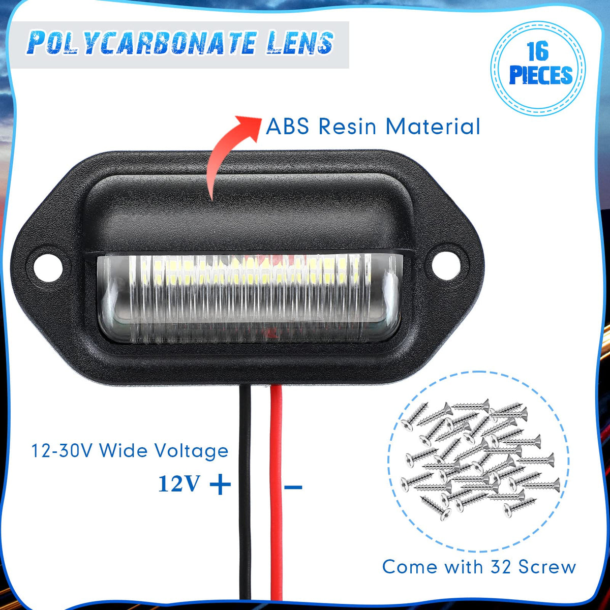 Features: Multi functional lights: The LED license plate motorcycle light can not only be applied as license plate light, motorcycle LED tag light, side light, tail light, step courtesy light, but also be applicable as dome or roof light, under hood light, trunk light, cargo light and more, providing with good safety and visibility. Easy to store and carry: Featured with light weight and compact size, the trailer white LED lights are convenient for you to put some of them on your car or in your tool box, thus to use and replace directly when needed outdoors. Specifications: Main material: ABS Size: as picture shown Quantity: 16 Pieces Package includes: 16 x LED license plate lights 32 x Screws Notes: Manual measurement, please allow slight errors on size. The color may exist a slight difference due to different screen displays. Please keep away from little, to avoid swallowing risk of small parts.