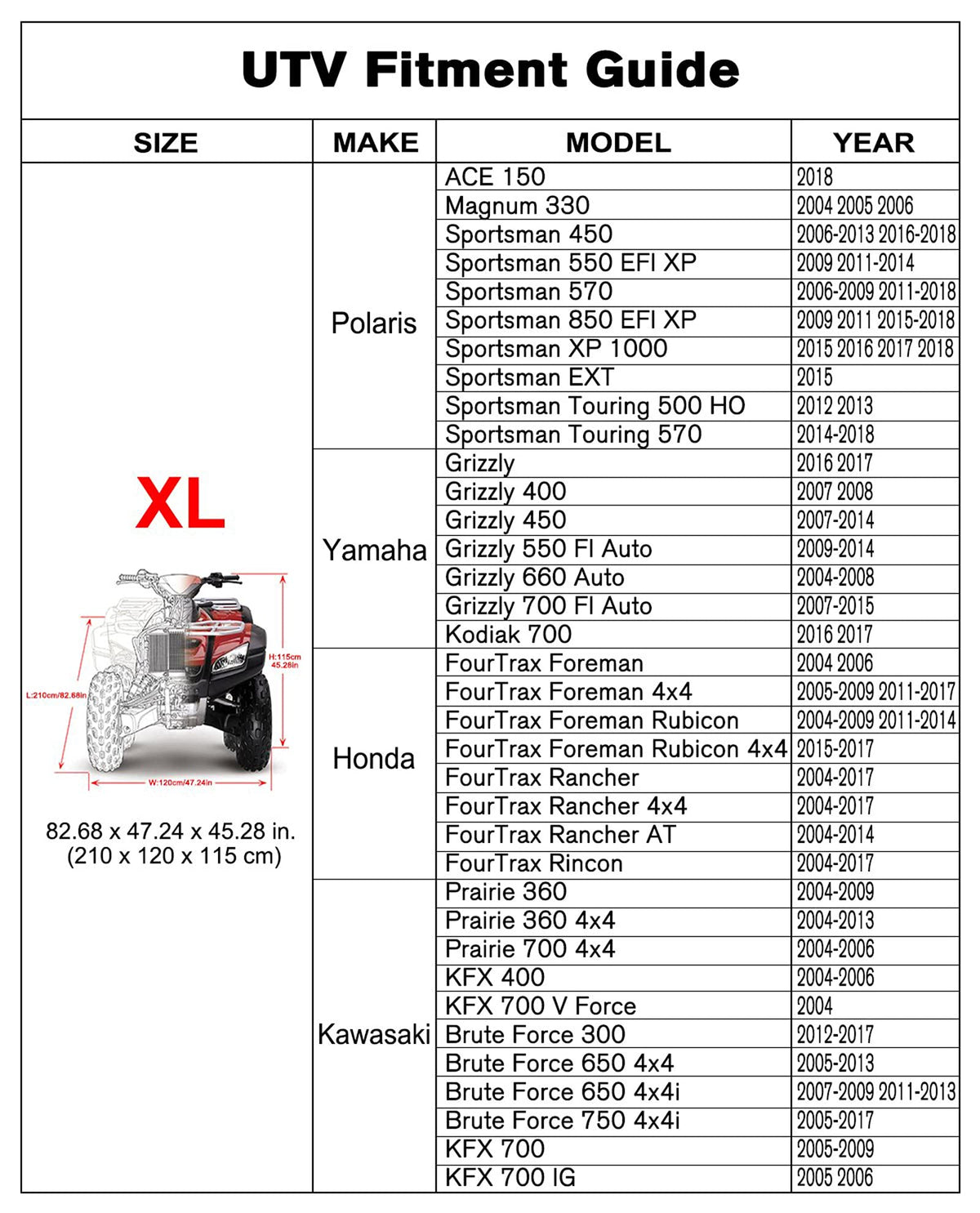 Q: What sizes are available for the NEVERLAND ATV Cover?A: The NEVERLAND ATV Cover is available in multiple sizes including M, L, XL, XXL, and XXXL. The dimensions for each size are as follows: M Size (145x85x98cm), L Size (200x95x106cm), XL Size (210x120x115cm), XXL Size (220x98x106cm), and XXXL Size (256x110x120cm). It's important to choose a size slightly larger than your ATV for a proper fit.