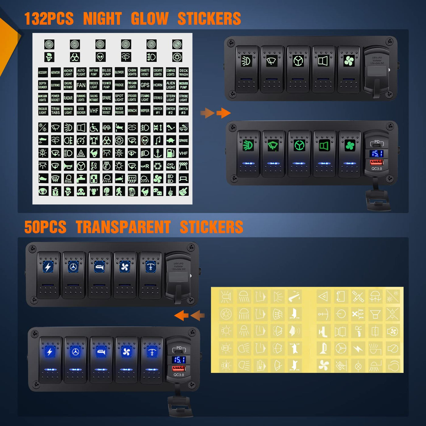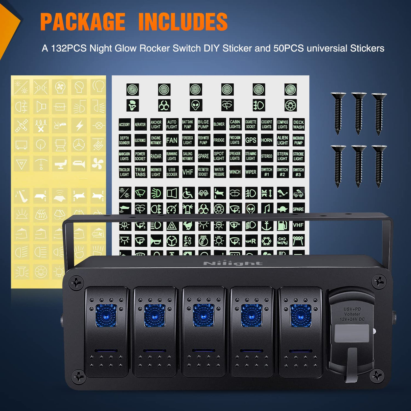 Nilight 5 Gang Rocker Switch boxwith PD Type C and USB Charger and VoltmeterInput voltage: 12V/24V DCSwitch Terminal: 5 PINInstallation: Panel Mount, Pre-wiredNilight 5 gang switch box can be used to control Underglow lights, whip lights, rock lights, LED light bars, LED work lights, rear lights, fog lamps, driving lights, headlights, taillights, off-road lights, auxiliary lights, boat lights, etc.Equipped with a sticker, you can define the name and assign switches according to your needs. The product fits most cars, SUVs, ATVs, UTVs, 4X4, motorcycles, trucks, Wranglers, boats, yachts, and other off-road vehicles.Note:Amp rating for the Whole Switch Panel wired in series: 12V DC/20AMP; 24V DC/10AMP.Please wire a relay if you are going to hook an accessory that is over 20AMP at a 12VDC power source. Or the switch will be burnt out due to its high current.
