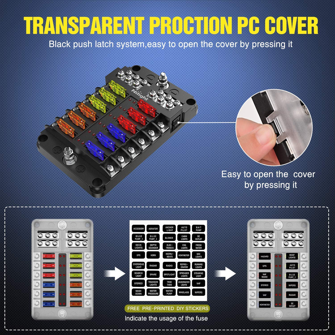Nilight 12-Circuit Atc/Ato/Blades Fuse Block With Led Indicator Light.Convenient Led Indicator Designeach Circuit Comes With A Red Led Warning Light That Would Help You Quickly Identify The Problem And Take Measures.Free Blade Fusesprovides Electric Device Name Labels To Find Out The Broken Part And Easy To Troubleshoot In Outdoor.Black Push Latch Coverdesigned With Clip-Lock Protection Cover. Just Need To Press It, You Can Easily Open The Cover. Also, This Would Protect Your Fuse From Dust, Damp And Broken.Package Includes:6-Way Blade Fuse Block With Cover5A Fuse X 610A Fuse X 615A Fuse X 620A Fuse X 6Screws X 4Stickers X 2