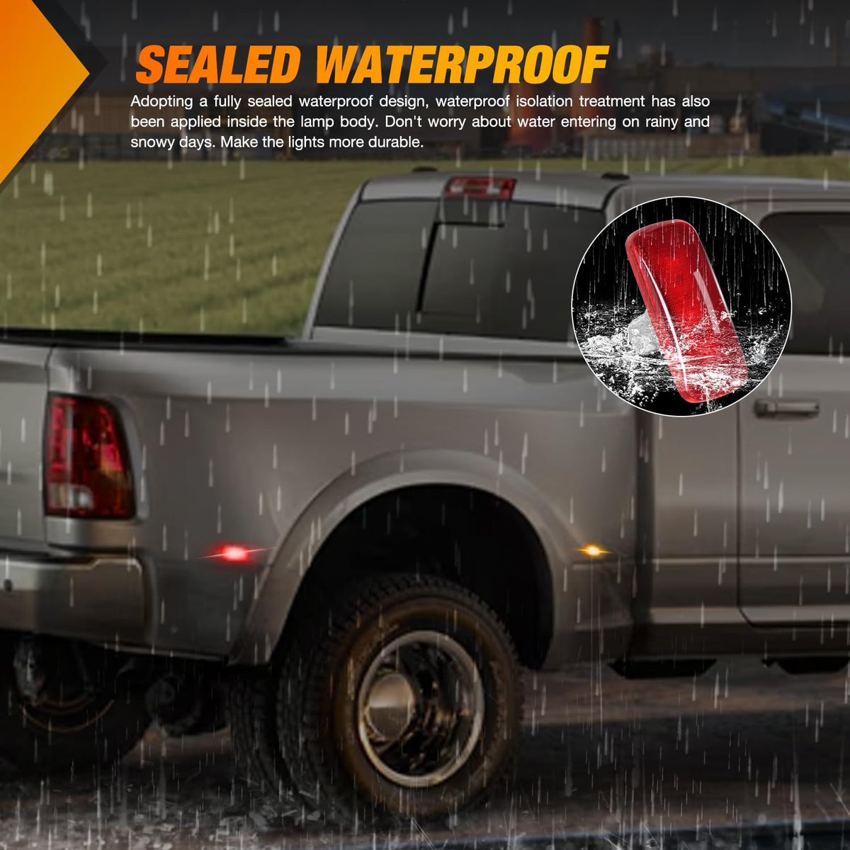 Excellent LED: Each marker light contains 3 pcs red/amber 2835 SMD LEDs, with bright and visible lighting performance. Enable vehicles on the sides and behind to clearly see changes in lighting, effectively reducing collisions | IP65 Sealed Waterproof: The lens and bottom shell of the lights are made of PC, which is sturdy, wear-resistant and scratch resistant. The tight fit between the bottom shell and the lens ensures the waterproof performance of the entire light. Can work normally even on rainy days | Quick Installation: Just need few minutes to finish the installation. Firstly, unplug the old light and press the clip inside to slide it out. Secondly, snap the mounting clip on the back of the light into the mounting slot. Finally, insert the plug and play plug and the light can light up normally | Perfect Fit: Used as LED wheel fender marker light, compatible with 12V DC 2010 2011 2012 2013 2014 2015 2016 2017 2018 Dodge Ram 2500 3500 Super Duty Dully vehicles only. Also DIY as front side rear marker light clearance light for truck, trailer, bus, boat etc | Package Include: 2 pcs red wheel fender marker light and 2 pcs amber wheel fender side marker light. With plug and play plug, durable and sturdy clip for using