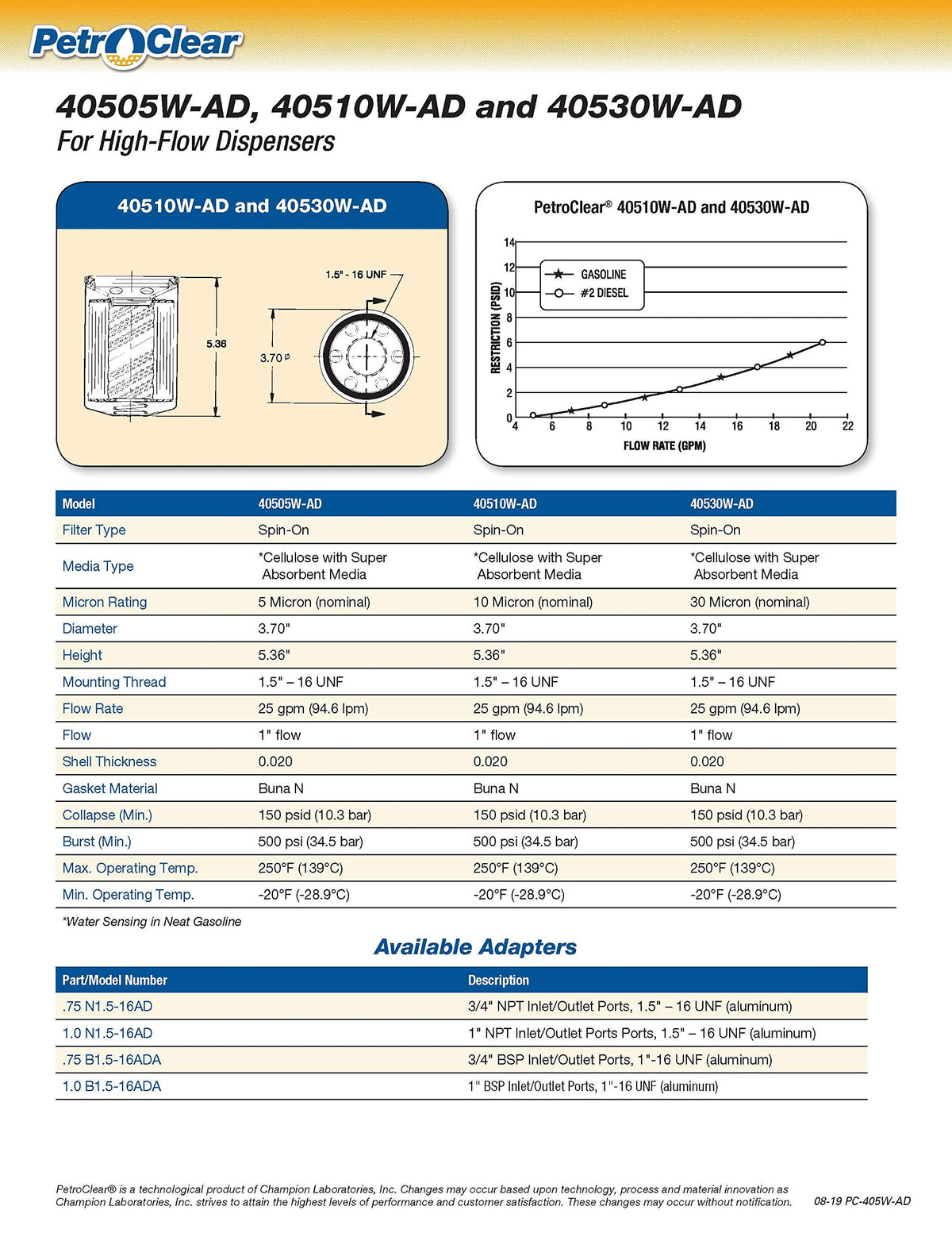 Q: Are there any adapters available for the Petro-Clear 40510W-AD filter?A: Yes, adapters are available for the Petro-Clear 40510W-AD model, ensuring compatibility with various fuel systems.