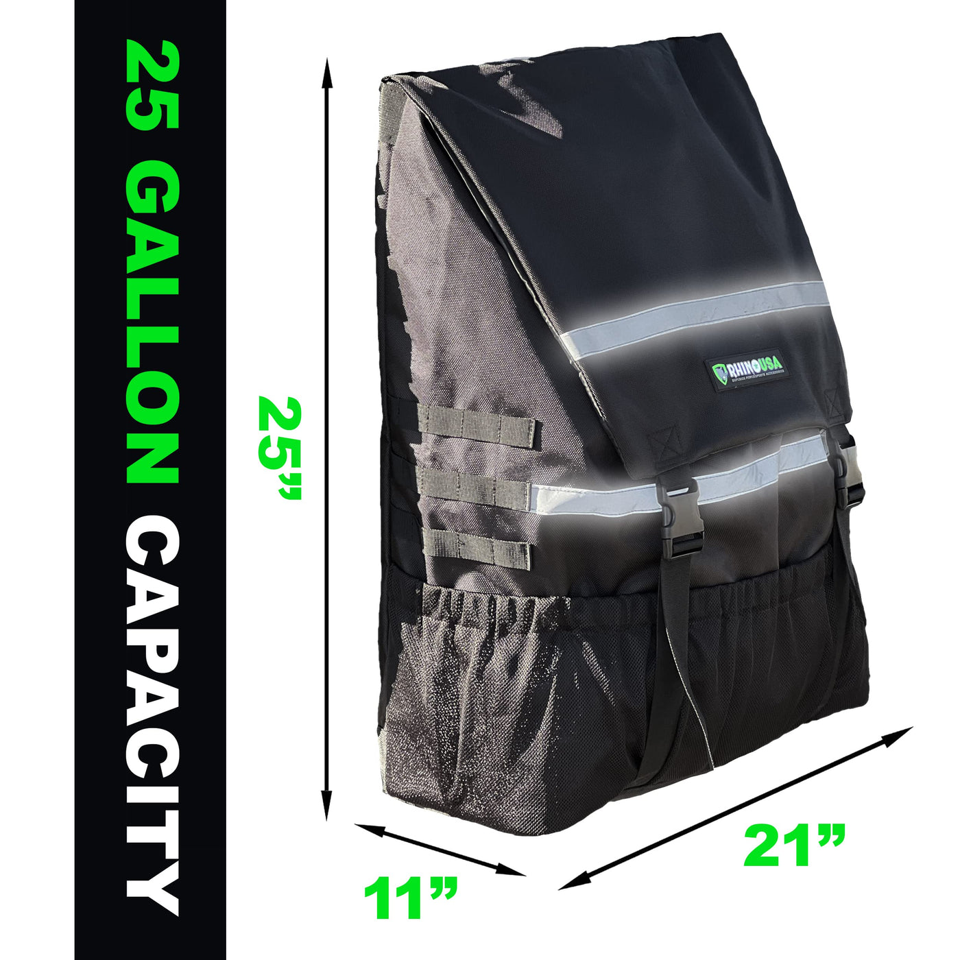 Q: What is the storage capacity of the Rhino USA Spare Tire Trash Bag?A: The Rhino USA Spare Tire Trash Bag has a generous storage capacity of 25 gallons, allowing you to store various items such as trash, camping gear, tools, and firewood securely.