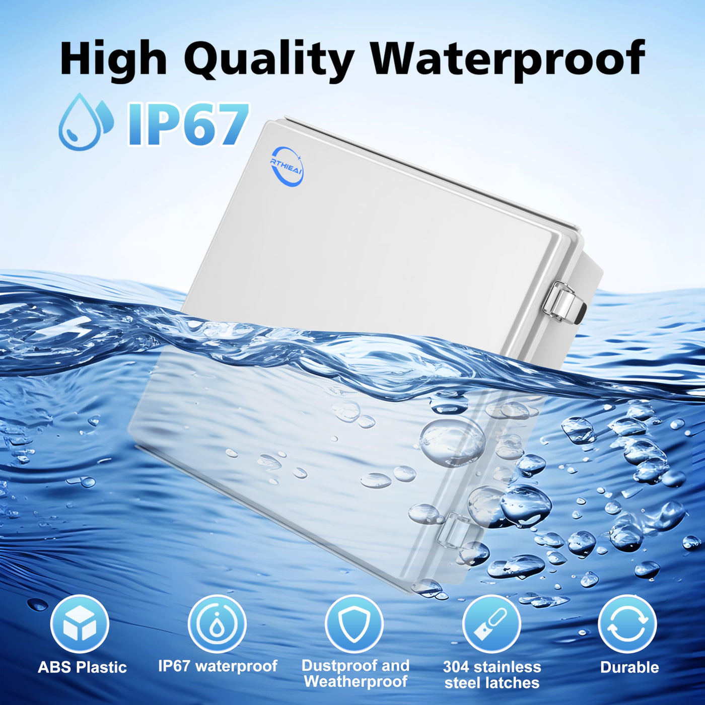 Q: What is the IP rating of this electrical enclosure?A: This junction box features an IP67 rating, indicating it is completely dust-tight and can withstand immersion in water up to 1 meter for a limited time, making it ideal for outdoor use.