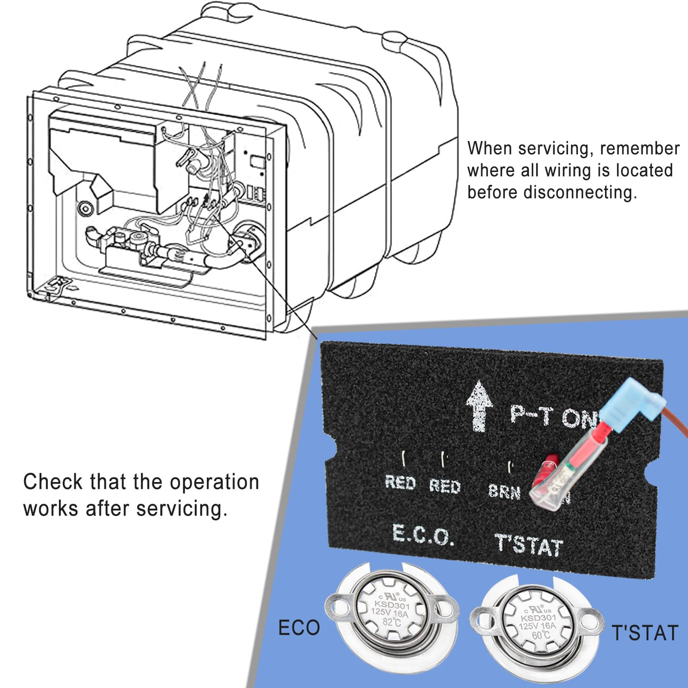 Rv Water Heater Thermal Cutoff Kit Compatible With Electric Water Heater Models: Gc6Aa-7E, Gc6Aa-8E, Gc6Aa-9E, Gc6Aa-10E, Gc6Aa-10A, Gch6-4E, Gch6-6E, Gch6-7E, Gc6A-7E, Gh6-6E, Gh6-7E, Gh6-8E, G6A-6E, G6A-7E, G6A-8E, Gch6A-7E, Gch6A-8E,Gcg6A-9E, Gch10A-2E, Gch10A-3E, Gh10-1E, G610-3E, Gh610-3E, G10-2E, G10-3E, Gc10-1E, Gc10-2E, Gh10-2E, Gh10-3E, G6A-2E, G6A-3E, G6A-4E, Gh6-3E, Gh6-4E, Gch6A-10E Package Includes: 1 X T'Stat Assembly 1 X Eco Assembly 1 X Black Foam Cover 2 X Fuses 2 X Copper Connecting Wire Note: Please Check The Part Model Number Before Purchasing To Ensure It Fits Your Water Heater. If You Have Any Questions, Please Feel Free To Contact Us.