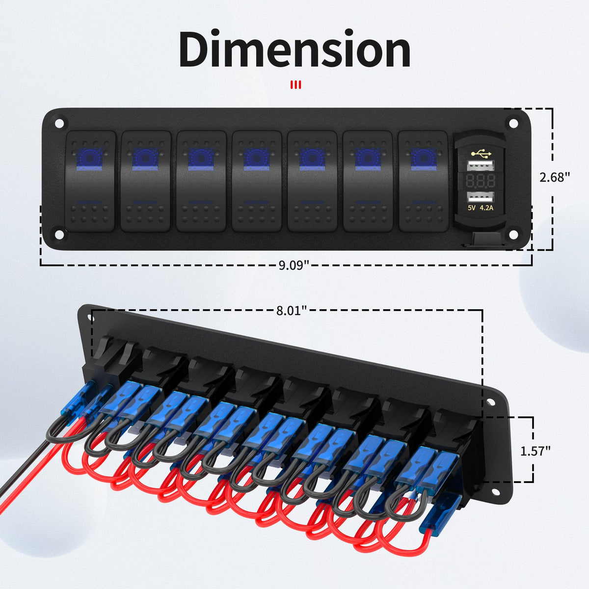 7 Gang Rocker Switch Panel Marine Boat Toggle Switch Panel Waterproof With Usb Charger Voltmeter 12V 24V Dc For Automotive Vertical Utv Truck Specifications: Rating: Dc 12V 20A/24V 10A; Type: 5 Pin Spst On/Off; Waterproof: Ip66; Material: Panel: Aluminum Panel+Superior Abs&Pc