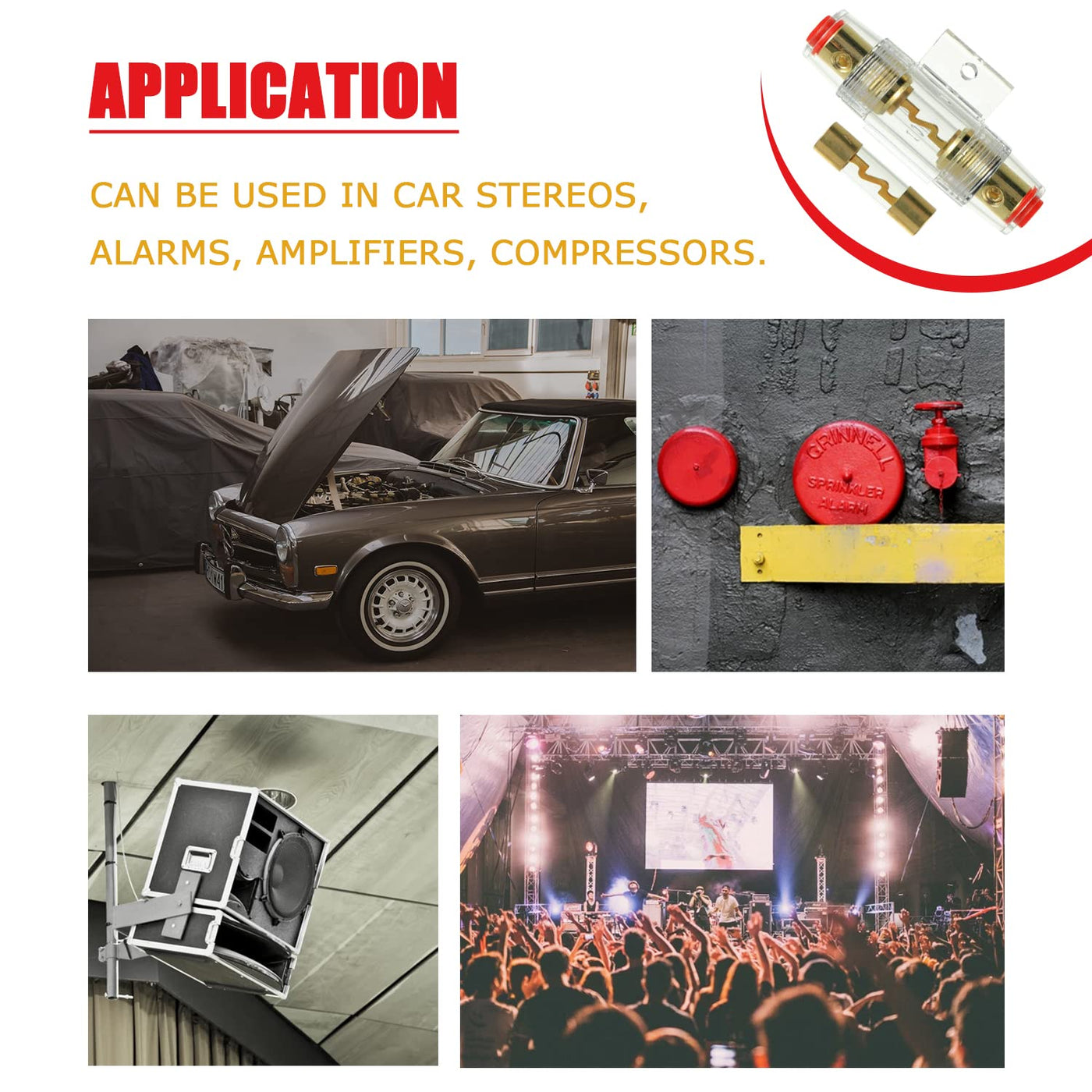 SIGANDG Inline Gold Plated AGU Fuse Holder & AGU Fuse AGU Fuse Holder Size:Length:8.5cm/3.34'', diameter:17mm/0.67'', mounting hole diameter:5mm Applicable fuse specifications:10x38mm Wiring Specifications: suitable for 4/6/8/10 wire Advantage:flame retardant, high temperature resistance, moisture-proof, waterproof, not easy to break AGU Fuse Current: 100A Voltage: 12V Size:10x38mm Application Can be used in car stereos, alarms, amplifiers, compressors. Function To prevent excessive current, automatically cut off the power supply and play a protective role. Package Includes 1 * AGU Fuse Holder 2 * AGU Fuses