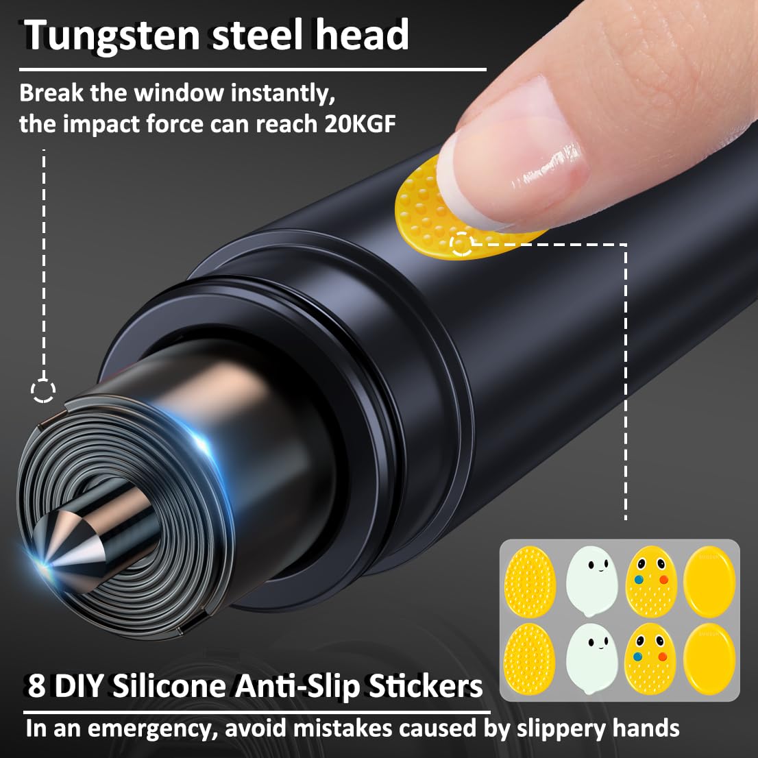 Q: How does the smosun Safehammer glass breaker work?A: The smosun Safehammer features a high-pressure spring mechanism and a tungsten steel blade that can break tempered glass instantly with an impact force of 20KGF. Simply press the tool against the glass for effective use.