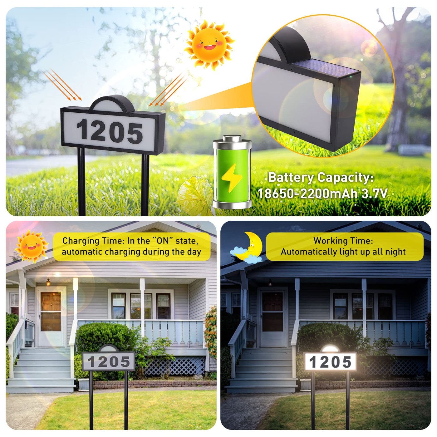 Q: What is the battery life of the solar address sign?A: The solar address sign has a built-in 2200mAh battery that takes 6-8 hours to fully charge in sunny conditions. Once charged, it can provide up to 20 hours of continuous lighting, ensuring visibility throughout the night.