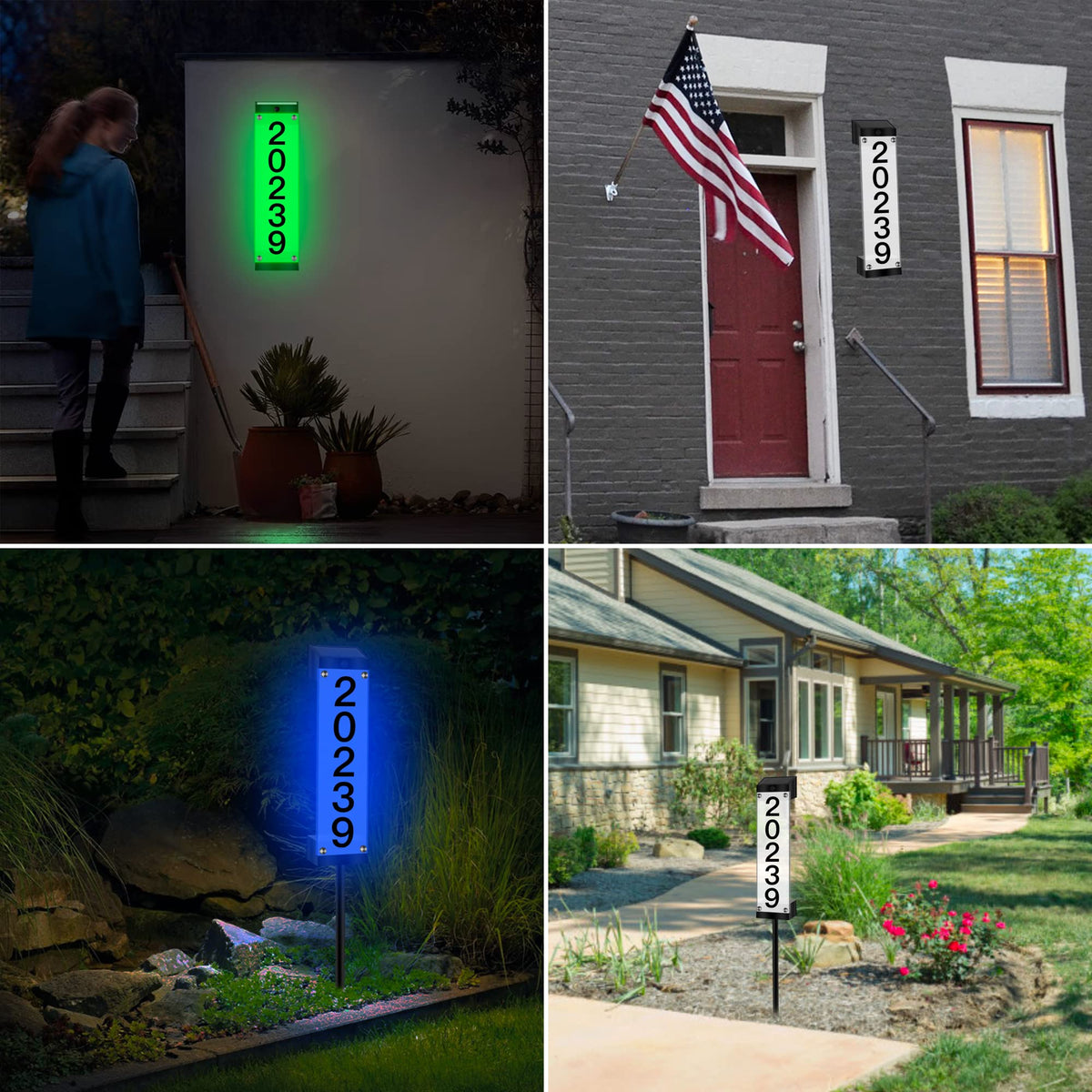 Q: What colors does the solar house number sign display?A: This solar house number sign offers 7 colors, including red, green, blue, yellow, cyan, purple, and white. It also has a color-changing RGB option that can be controlled with a remote to choose your preferred color or flash mode.