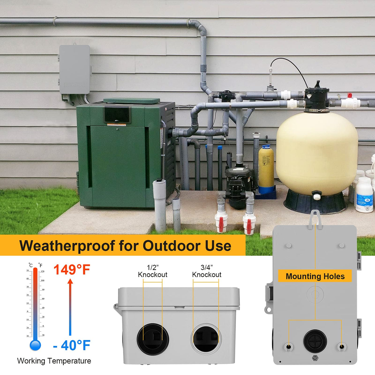 Suraielec Outdoor Indoor 7-Day Programmable Digital Timer Switch Box for Powerful Electrical Appliances Save yourself time, money, and hassle by getting our Suraielec automatic digital pool timer. After setting it, it keeps your pool running on a regular schedule without forgetting to turn it off so your water stays clean without creating outrageous electricity bills and you won't have to lift a finger. It also saves you chemical and maintenance costs from failing to run it as often as you should. You won't run the risk of forgetting to run your filtration system or having to leave it off if you go out of town. It also turns on your holiday lights or schedule the sprinklers without even having to step outside, avoids the inconvenience of plugging and unplugging your outdoor lights, holiday decorations, and other high-power appliances. Up to 20 ON/OFF program settings satisfy customers' most needs easily. 15 day combinations repeat cycle options are easy to select and bring convenience to you. This digital pool pump timer is smart enough to automatically adjust for daylight savings time. Do not need to reset the clock twice per year. 120-277VAC, 40-Amp Resistive, 2HP Heavy Duty Timer Controls and Schedules Large Load Devices Pool Pump Spa Control Hot Water Heater Submersible Pump Air Compressor Irrigation System HVAC Equipment Pool's Filtration System Water Fountains and Music System Exhaust, Attic, and Circulation Fan Electronic Entertainment Control Landscape, Patio, Christmas Holiday Light Outdoor Lighting and Seasonal Decoration Other High Power Appliance, and Workstation.