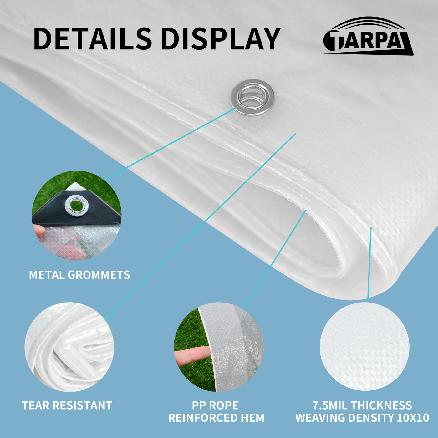 Q: Are there any special features of the TARPAL tarp that enhance its durability?A: Yes, the TARPAL tarp features metal grommets at each corner for easy fastening and a thermal binding edge design that strengthens the edges, enhancing durability and resistance to wear and tear.