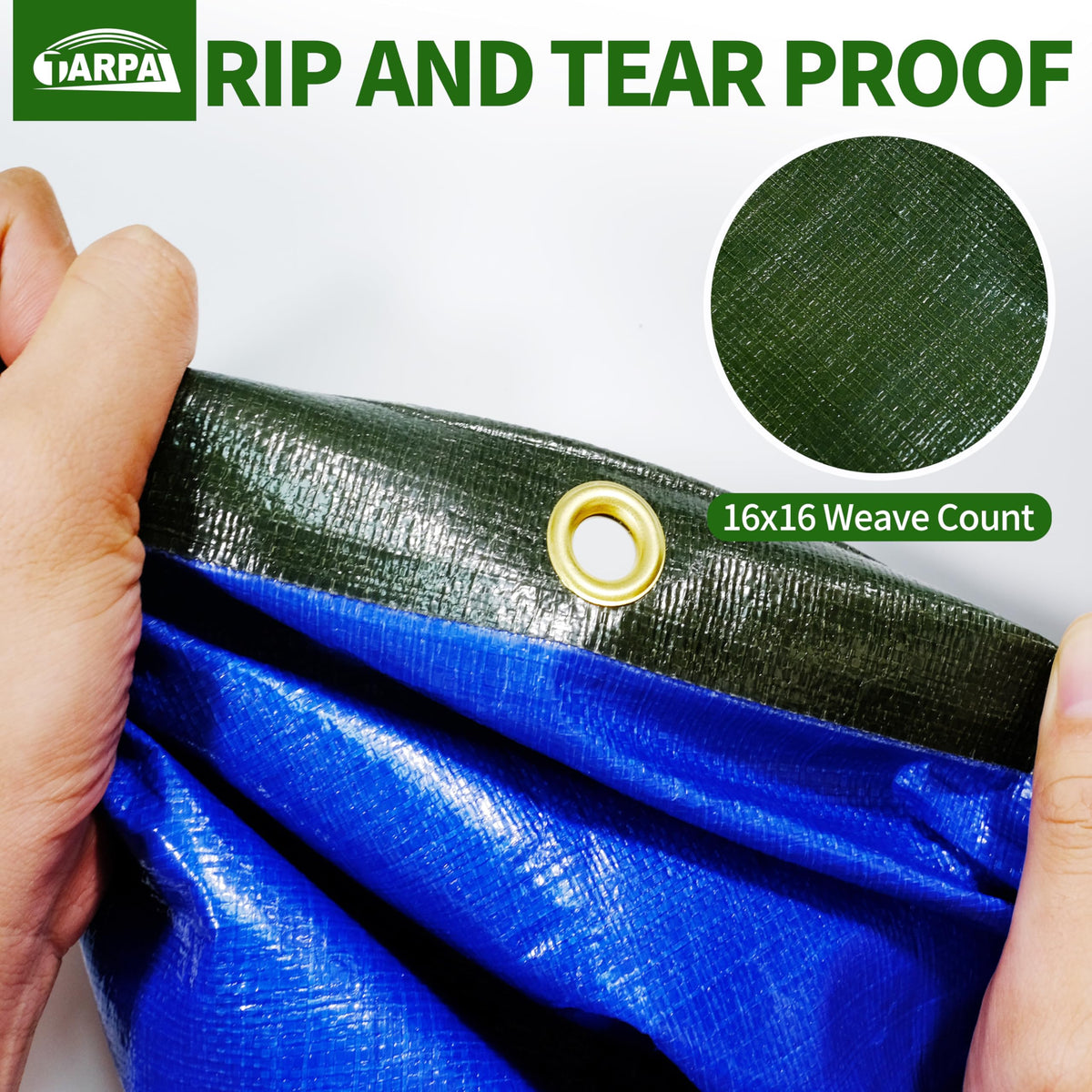 Q: What are the main features of the TARPAL Heavy Duty Waterproof Tarp?A: The TARPAL Heavy Duty Waterproof Tarp features a 16 mil thickness made from tightly woven polyethylene fibers, offering superior tear and wear resistance. It has rust-proof brass grommets placed every 17.7 inches for secure fastening, and is reinforced at the corners and edges for added durability. The tarp is also 100% waterproof and can withstand harsh weather conditions.
