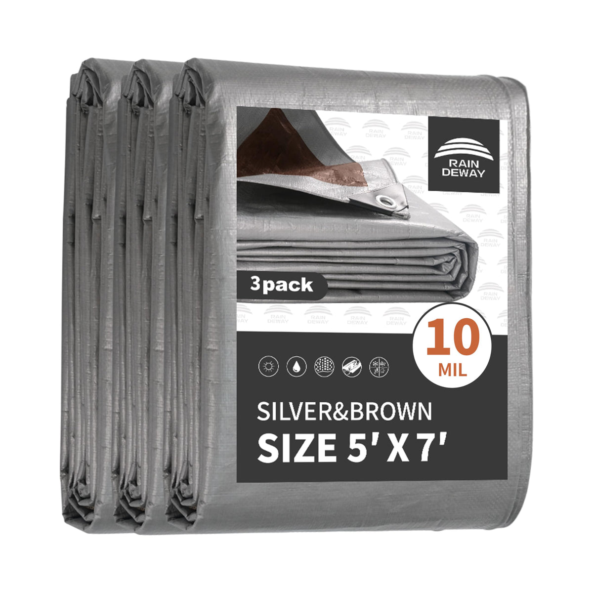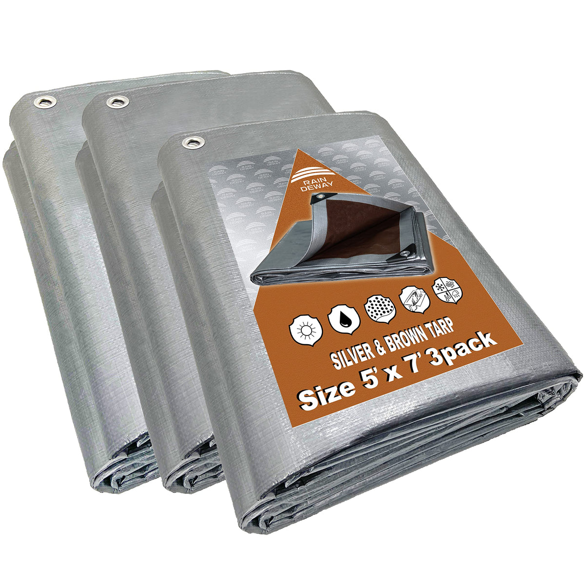 Tarps Heavy Duty Waterproof 5X7 Feet (3 Pack), 10Mil Multipurpose Small Tarp Cover With Metal Grommets And Reinforced Edges, Silver/Brown Tarp By Raindeway