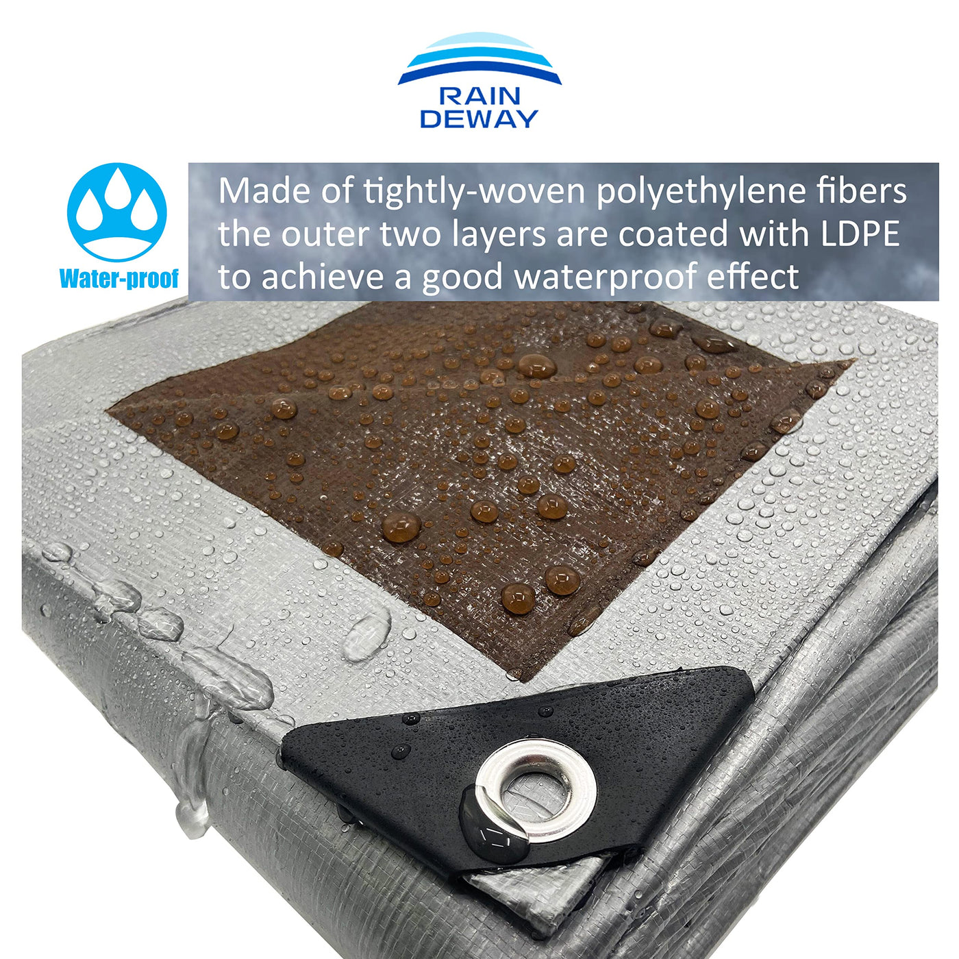 About RAINDEWAY Tarp: RAINDEWAY tarp is made of tightly-woven polyethylene fibers; 10Mil Thickness Heavy Duty tarp , 5.9 oz / sq yard; Metal grommets around the edges for better durability; Silver / Brown two color design, Can be used on both sides; High quality polyethylene tarp & waterproof. Good For What You Need It For: To cover your backyard pool; To cover the patio furniture; To be a ground cloth for tent or Easy to tarp up your tent; Slip and slide kickball; Keeping dirt out of the back of your truck; Providing a surface for your implements or plants; Cover your pet cages on cold evenings or rain day; Wrap your wooden side by grommets (holes) to be up to tie down or to insert bungee wrap; Dump truck tarp , Leaf tarp , etc.
