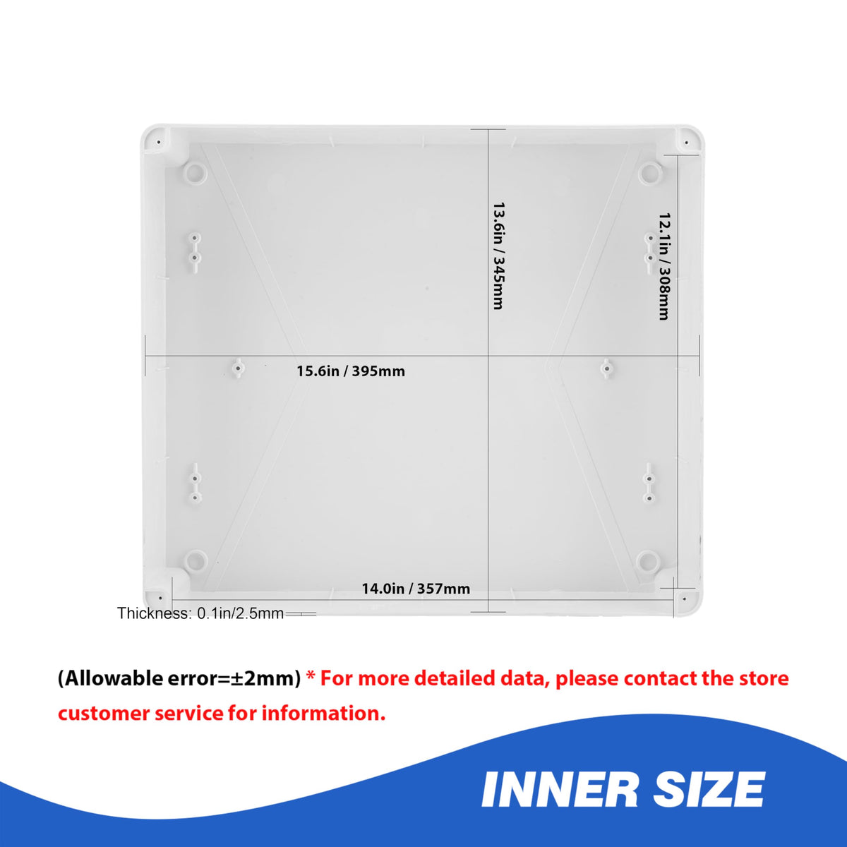 Q: What are the dimensions of the Tavonuxt Waterproof Electrical Junction Box?A: The Tavonuxt Junction Box measures 15.7 inches x 13.8 inches x 4.7 inches (400mm x 350mm x 120mm).