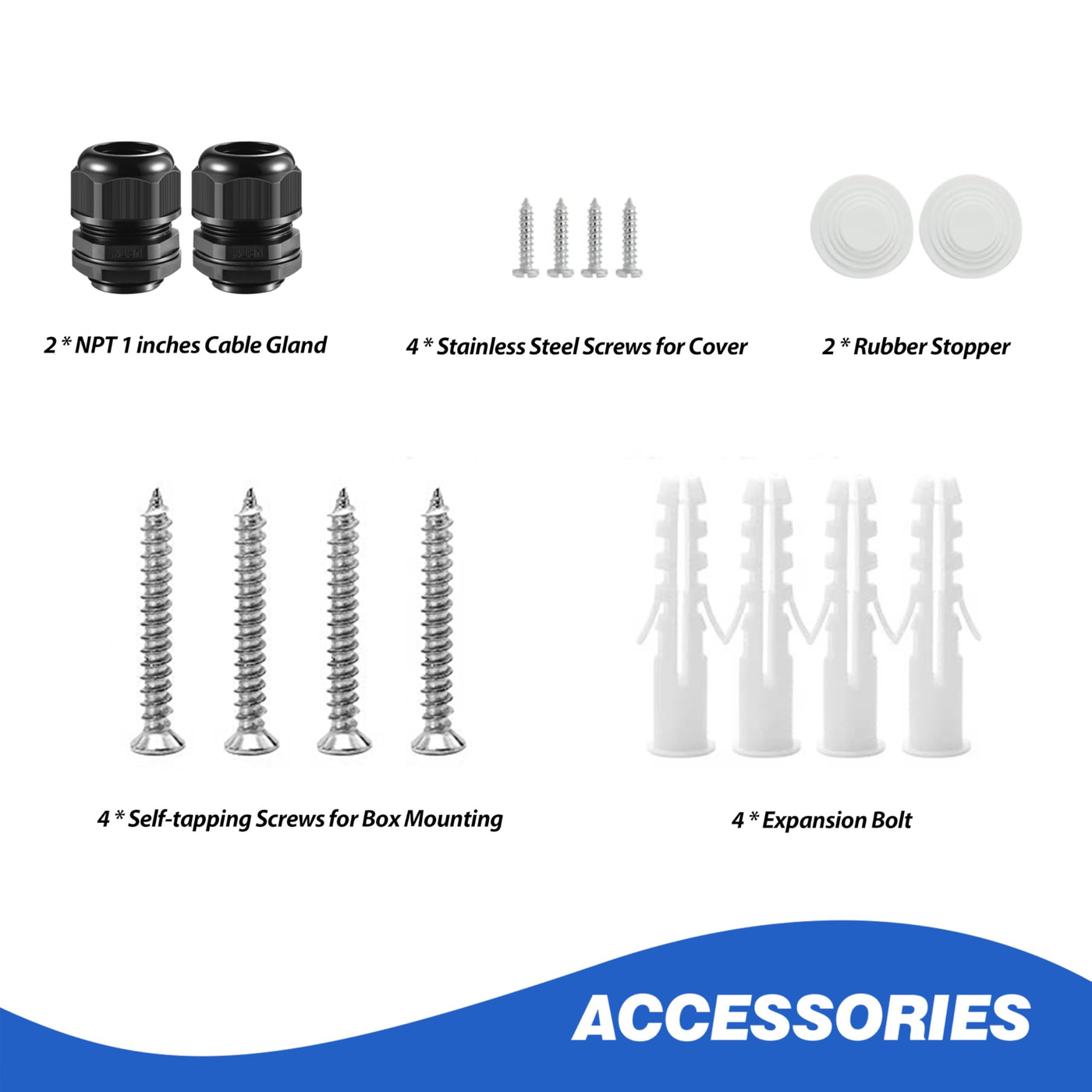Q: What does the package include when purchasing the Tavonuxt Junction Box?A: The package includes 1 plastic junction box, 4 stainless steel screws for the box cover, 4 self-tapping screws for mounting, 4 expansion bolts, 2 M36mm rubber stoppers, and 2 NPT 1" cable glands.