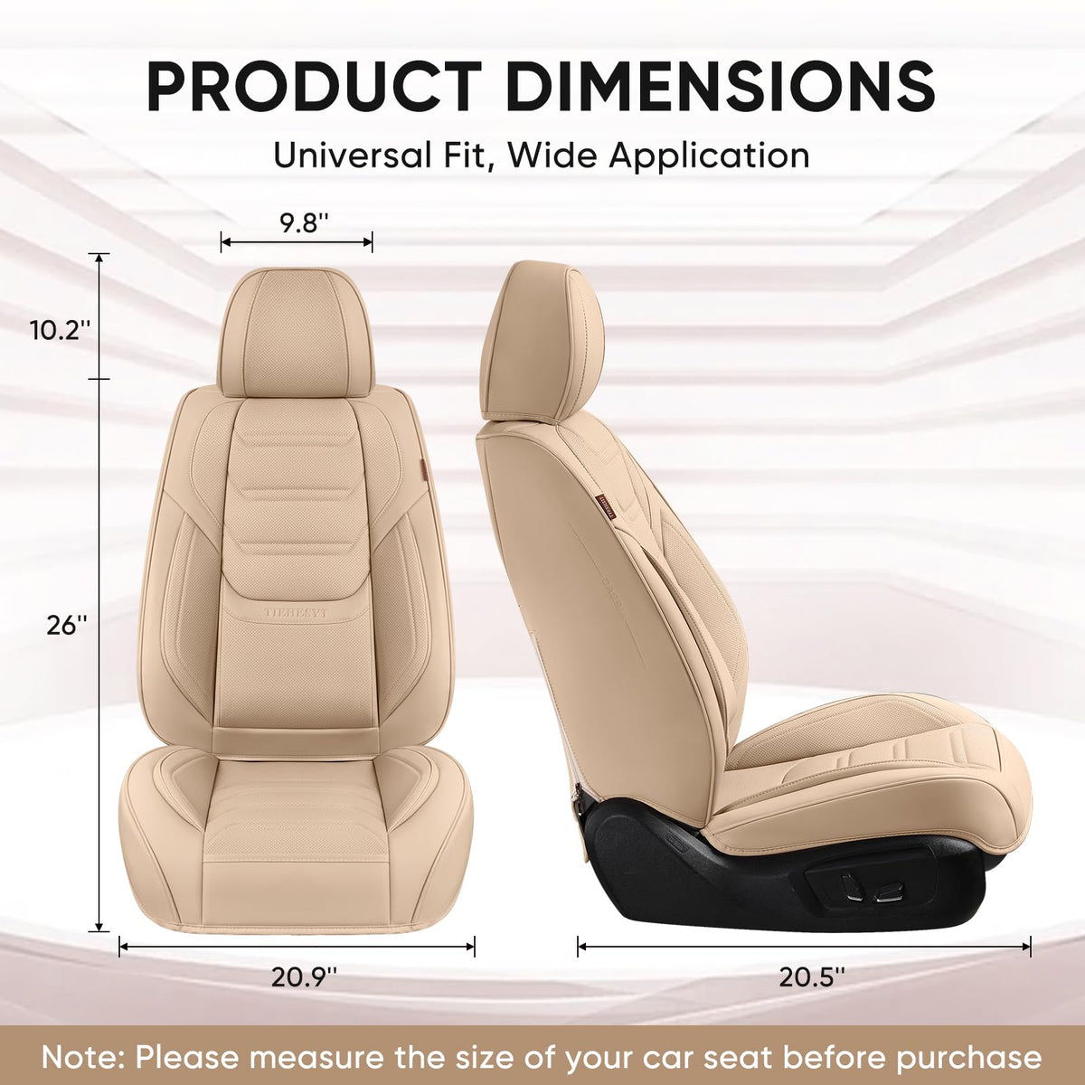 ?Brand Introduction? TIEHESYT is a professional manufacturer commit to the development, production and sales of automotive products, with 17 years of experience in manufacturing. We always adhere to the purpose of ''Innovation, Quality, Reputation'', and constantly produce a variety of superior car seat covers, breathable, waterproof, all-season universal, to meet the multifaceted needs of customers, to provide drivers with quality products and services. Purchsing TIEHESYT car seat covers can not only make your driving more comfortable, but also can better protect your car seat. Hurry up to install a suitable car seat cover for you and enjoy a good journey. ?Package Included? Front Seat Cover - 2 pcs Headrest - 2 pcs ?Colors? Elegant Black/Mature Brown/Sport Red/Cute Pink/Graceful Gray/Faddish Beige ?Package Size? 25.5''*21''*5.5''/66cm*55cm*14cm ?Product Weight? 11lbs/5kg ?Materials? Suede Cloth, PP cotton, Nonwoven, Sponge, Nappa Leather ?Vehicle Compatible? Sedans, SUVs, Trucks etc.