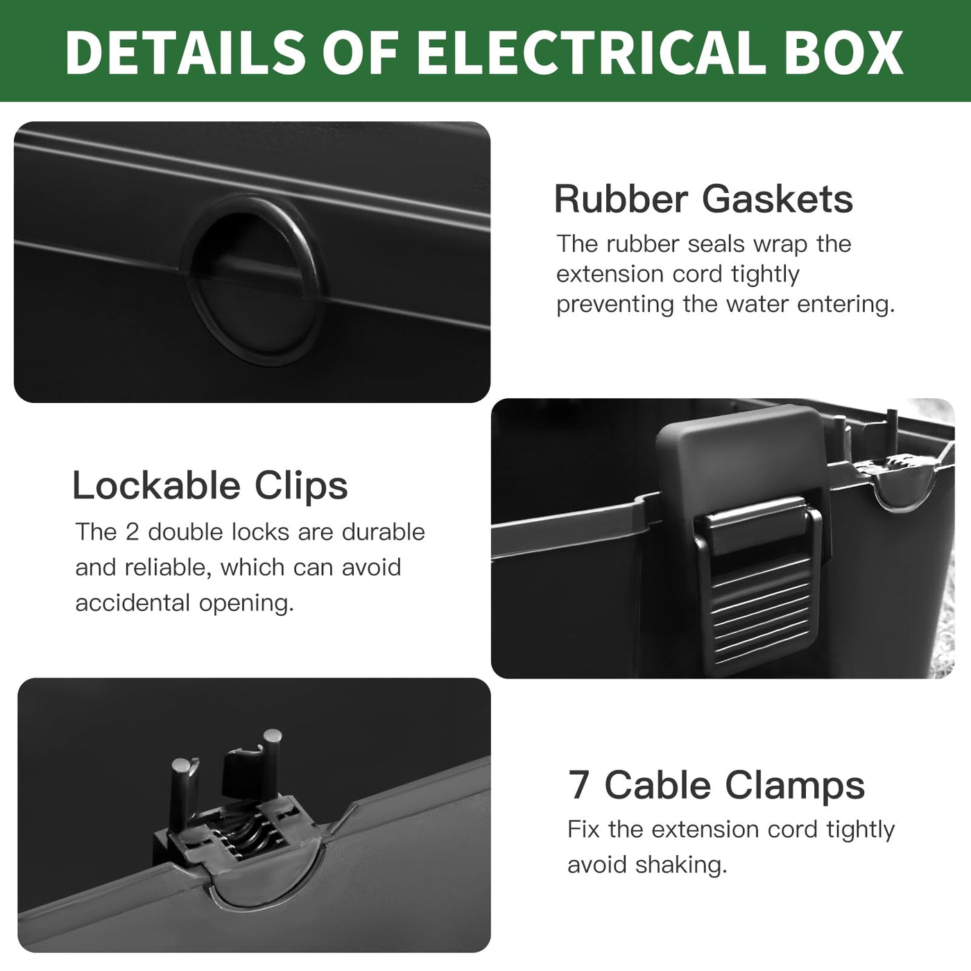 Q: What materials is the electrical box made of, and how durable is it?A: The electrical box is made from heavy-duty reinforced polypropylene (PP) material, designed to withstand external damage, shocks, and extreme weather conditions, ensuring long-lasting protection for your electrical connections.