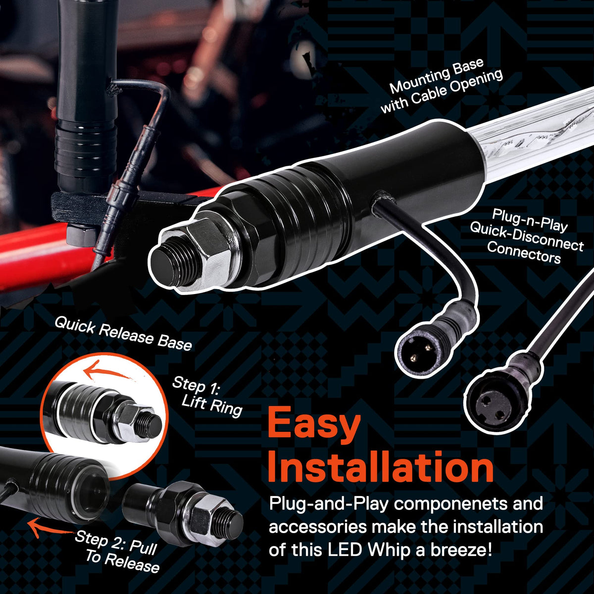 Q: Is the LED whip light easy to install?A: Yes, the LED whip light is designed for easy installation with Plug-n-Play components. It comes with an installation guide and all necessary accessories, making it simple for anyone to set up.