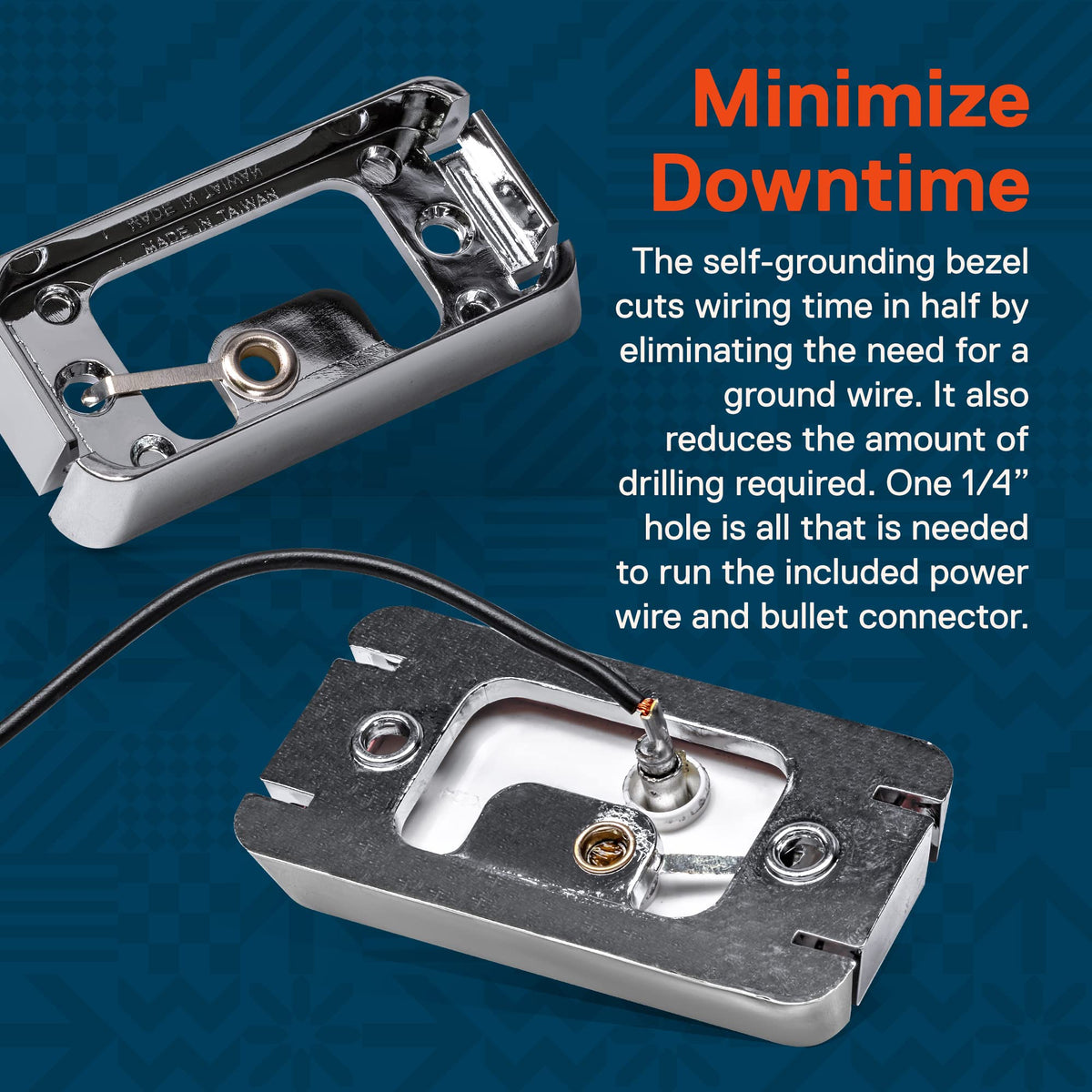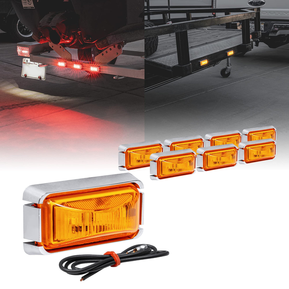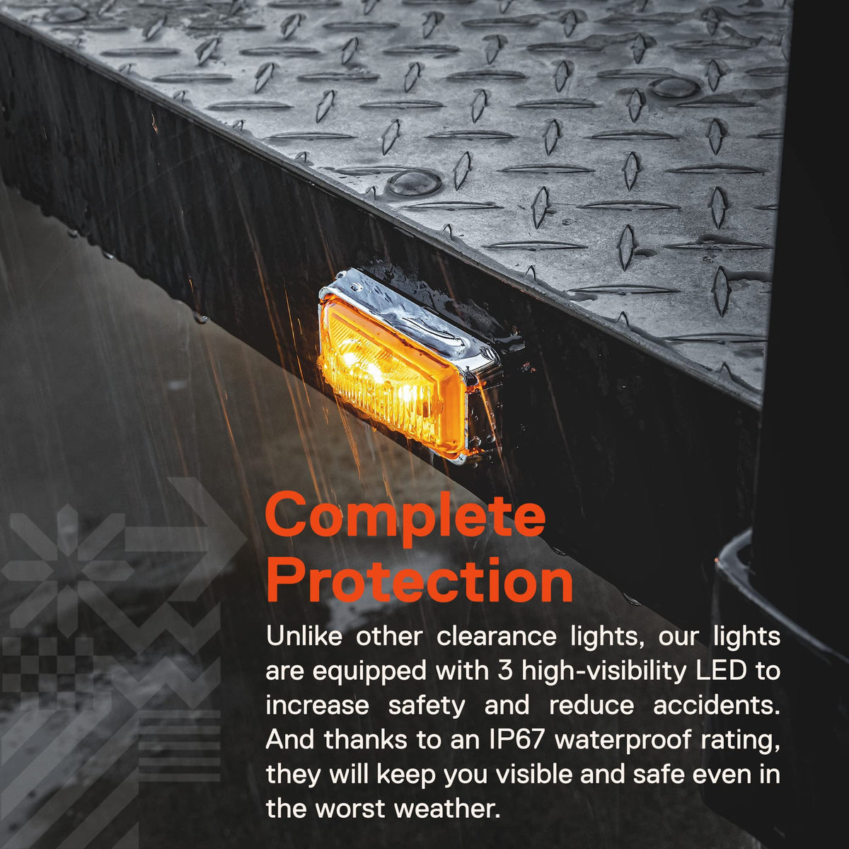 Better for Business Keep your business moving with our zero-maintenance, easy to install LED clearance lights. Our clearance lights come with a quick mounting base and a removable pigtail harness to simplify the install process. And with a sonically sealed body, an IP67 waterproof rating, and three long-lasting LED lights per unit, these clearance lights will save you time now and in the future.Improving SafetyOur lights take care of you so you can take care of business. With three LEDs per unit, they’re brighter and more noticeable than a traditional clearance light. And unlike most other clearance lights that are only visible with a 90-degree window, our PC-rated lights produce a 180-degree arc of light for greater range of visibility and safety. They can even be installed on the corner of a truck or trailer to function as both a side marker and clearance light.Keeping You LegalFinding a clearance light that meets your needs goes beyond just ease of use and longevity, the light must also meet DOT regulations regarding build quality, durability, and visibility. Lights that meet these requirements will be better, brighter, and last longer than other, weaker lights. Our lights either meet or exceed the requirements set out in DOT FMVSS-108 and are the ideal, safety-first choice for your trailer or vehicle.FeaturesPC Rated, 180 Degrees Viewing AngleSubmersible, IP67DOT FMVSS 1083 LEDs Per LightAmberSelf-Grounding, Chrome Mounting BasePower Wire with Bullet Connector What's Included?(8) 2.5'' Marker Light w/ Chrome Base Mounting Kit - AMBER(1) Rectangular Clearance Marker Light(1) ABS Chrome Base(1) Foam Protective Pad + Mounting Screws(1) 2-Pin Connector