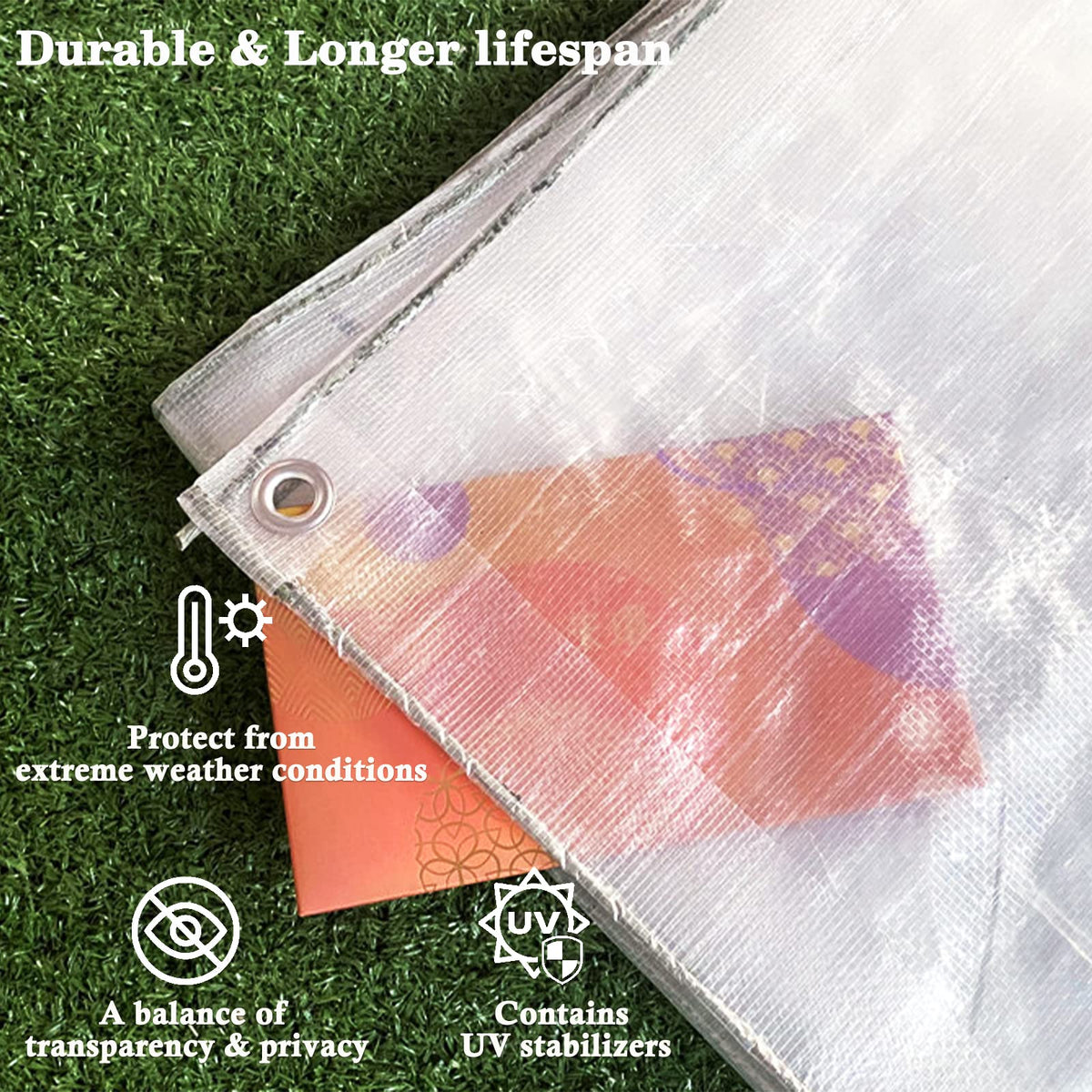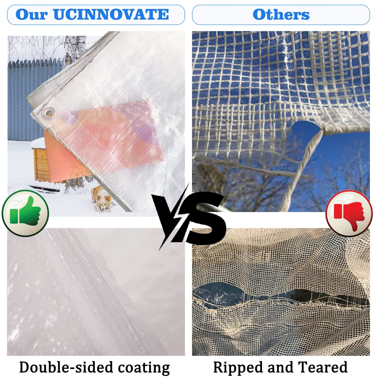 Q: How durable is the UCINNOVATE clear tarp?A: This tarpaulin is made of heavy-duty 120 GSM polyethylene, which includes reinforced corners and rustproof aluminum grommets. It is designed to be tear-resistant and withstand harsh weather conditions including rain, wind, and snow.