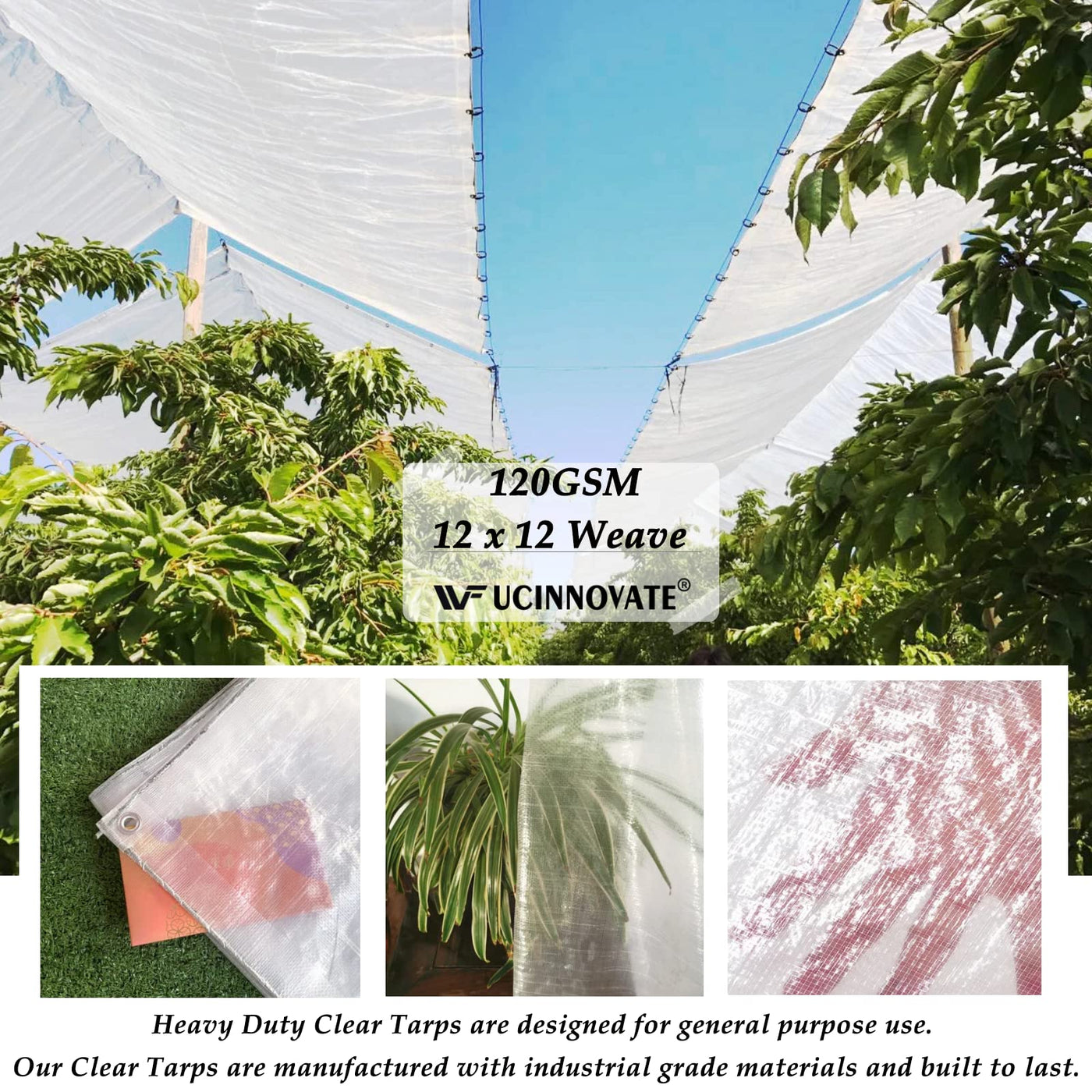 Q: How does the UV resistance of these tarps benefit outdoor use?A: The UCINNOVATE clear tarps are treated to be UV resistant, which helps protect your plants and outdoor spaces from harmful sun rays while allowing 70% light transmission. This makes them ideal for use in gardens, greenhouses, and patios.
