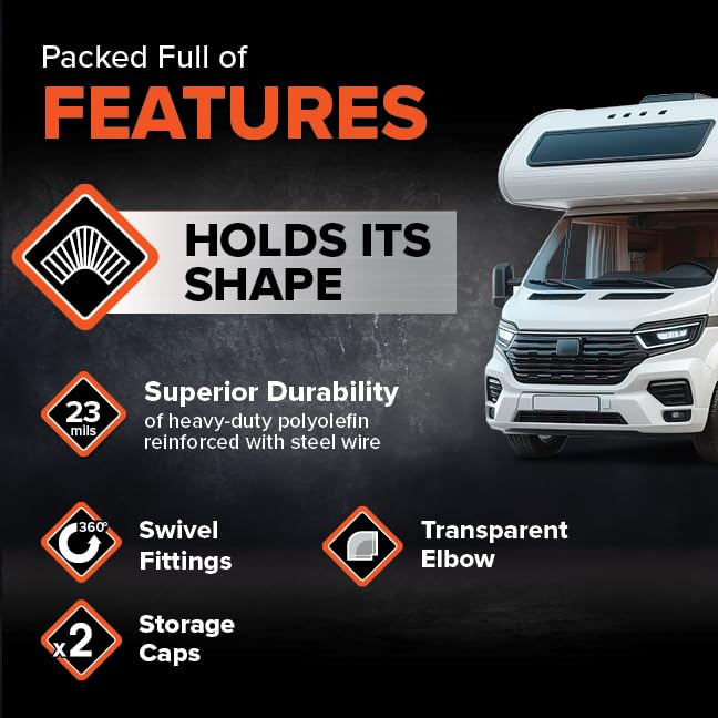 Make RV waste management easy with the Camco RhinoFLEX 15ft RV Sewer Hose Kit, the ultimate RV septic hose kit designed for simple and efficient RV waste tank dumping. This all-in-one camping essential provides effortless setup and dependable performance, making it an important item for your camping kit. Built with flexibility in mind, the RhinoFLEX sewer hose for RV campers easily bends and maneuvers around tight spaces or obstacles, and its collapsible design lets you extend only the length you need, minimizing mess and maximizing efficiency. When youre done, it neatly compresses for compact storage to save valuable RV storage space and keep your camper organized. Crafted with reinforced materials, the 15 ft RV sewer hose is tough, long-lasting, and holds its shape under pressure. Secure, no-leak RV sewer hose fittings ensure a reliable connection, while the clear elbow attachment helps you confirm when your tank is empty. The 4-in-1 adapter fits most sewer connections, offering a snug and dependable seal. When its time to pack up and go, the camper septic hoses collapse into a small, manageable size for easy storage. Made in the USA with quality you can trust, this Camco RhinoFLEX Camper Drain Hose Kit is a practical, durable solution to elevate RV living.