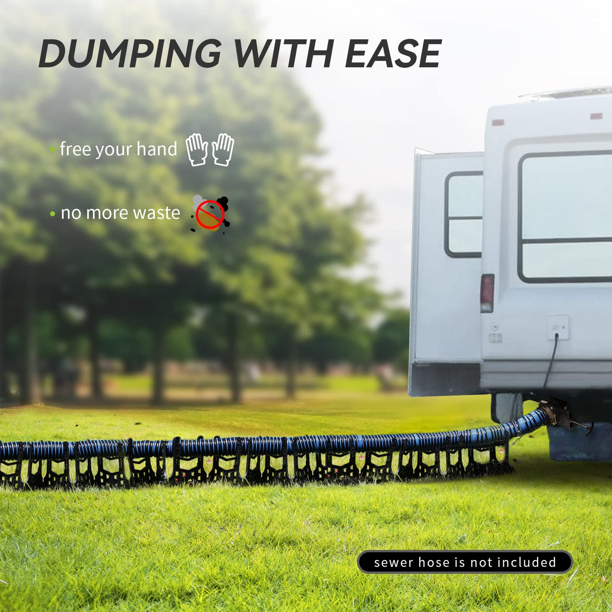 FAST DUMPING & NEAT ORGANIZATION: When you want to empty the waste tank at the end of vacation, RVMATE drain hose support can make dumping easier and more efficiently, no need to hold sewer hose and find shoes covered with waste! | QUICKLY SET UP: Place the hose support under RV waste port and pull it to sewer connection, then put the sewer hose on the support( reduce the amount of wear on the sewer hose when extending ). With the help of flexible accordion design, the hose support could be adjusted to fit around a corner and other obstacles. | DOWNWARD SLOPE DESIGN: After placing the hose support, you could see the sewer hose sloping downward towards the dumping station naturally, the waste will move through the hose quickly without being stuck inside the hose. | GREAT for OUTDOOR USE: Made of UV-resistant and lightweight plastic, the support is able to lift the hose stably under the circumstance of plenty rain and strong sunlight. | USEFUL ACCESSORIES: Every sewer hose support comes with non-slip gloves, thick organization strap and elastic anchor cords, keeping hands clean and making storage much easier.