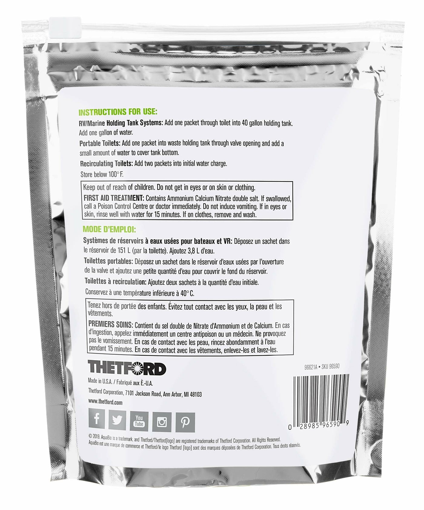 Q: What is Thetford AquaBio RV Holding Tank Treatment and how does it work?A: Thetford AquaBio RV Holding Tank Treatment is a formaldehyde and bronopol-free formula designed for RV holding tanks. It effectively eliminates odors and digests waste and toilet paper to prevent clogging, using a quick-acting and environmentally friendly approach.