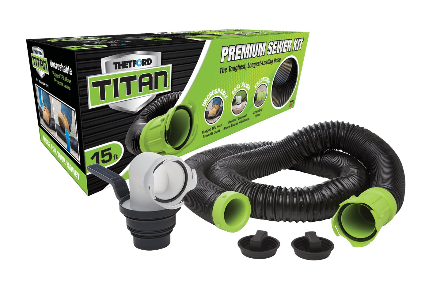 Titan 15-foot RV sewer hose is the premium sewer kit perfect for emptying the holding tanks and removing the unwanted waste from your recreational vehicle. Featuring the ergonomic Extend Grip bayonet, which allows a better grip, and the Revolve 5-in-1 sewer adapter with handle, the system can be attached to any RV sewer outlet and fits most dumping stations. Made of TPE, the rugged hose is uncrushable, provides high puncture and abrasion resistance and excels even in extreme temperatures. Titan 15-foot RV sewer hose kit includes one 15' TPE hose, 1 Revolve 5-in-1 Sewer Adapter with Exclusive Handle , and 2 end caps, ensuring no-mess storage experience.