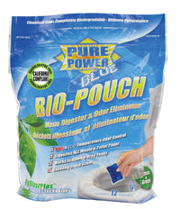 Pure Power Blue Bio-Pouches includes BioBlastPlus odor control technology. Biological enzyme/bacterial formula that performs in all temperature conditions. 1 pouch per 40 gallon black or gray water tank treatment. Accepted at all campgrounds and enhances septic tanks – CA compliant. Keeps tanks clean with a fresh clean scent.