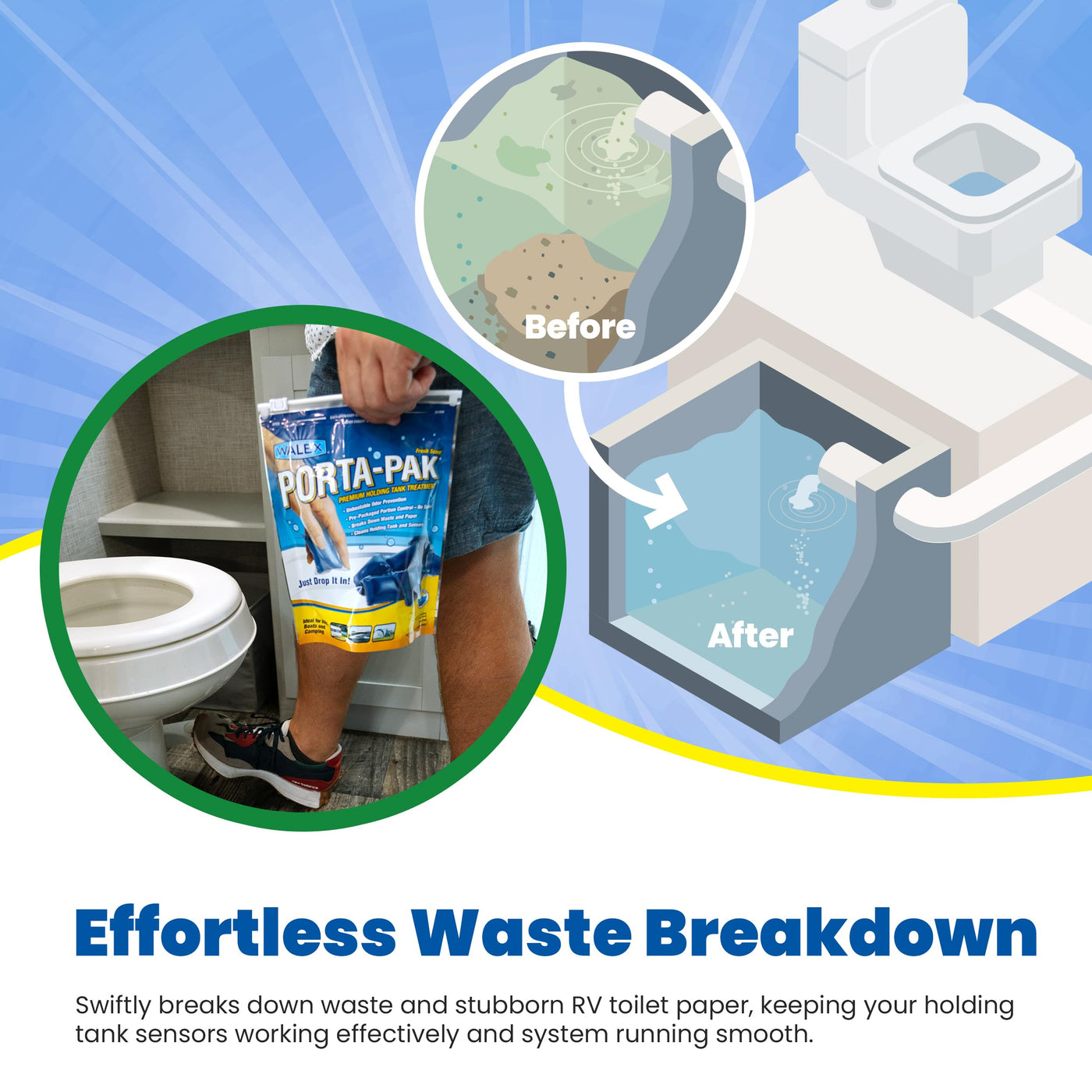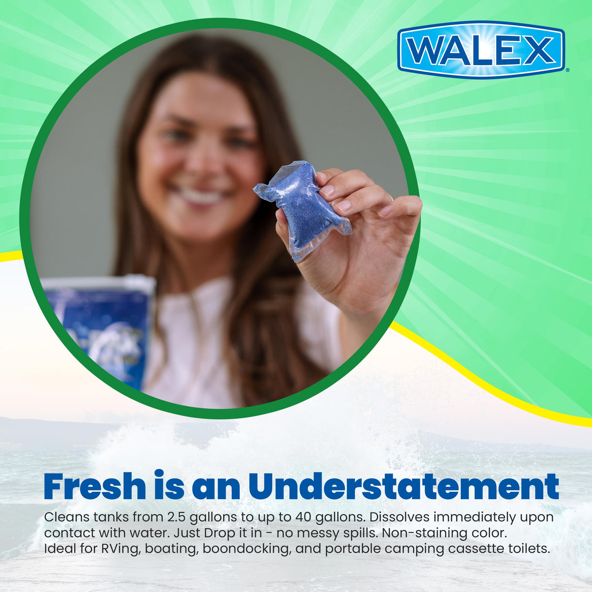 Tired of battling unpleasant odors and struggling with clogged black tanks? Look no further than Porta-Pak RV and marine holding tank deodorizer, your ultimate solution for a pristine RV or marine experience. Porta-Pak RV and marine toilet deodorizer is the ultimate marine toilet cleaner, camper tank deodorizer, portable toilet deodorizer, and black tank deodorizer for RVs and boats. Our powerful formula not only controls odors but also efficiently breaks down paper and waste. Our innovative, water-soluble tabs are designed for your convenience. Simply drop one in, and Porta-Pak RV and boat toilet cleaner starts working immediately without any messy spills. Continued use helps pipes, valves, and seals stay working smoothly. Experience the delight of a fresh fragrance that transforms your space. Porta-Pak marine and RV black tank pods are environmentally responsible. Our formula breaks down naturally, ensuring you leave a minimal footprint on the outdoors. Don't let unpleasant odors and clogs spoil your journey. Upgrade your RV or boat with Walex Porta-Pak RV black holding tank deodorizer drop-ins. Take control of your tank, eliminate odors, and enjoy the outdoors to the fullest.