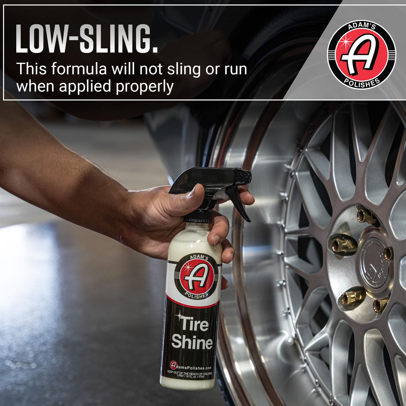 Adam's Tire Shine is intended to offer a lustrous deep shine on tires. This product was designed specifically for our customers that prefer a deep, rich shine or a wet tire look. We have tested this new formula for months to produce a product that will outlast other tire shine formulas and provide more shine. Adam's Tire Shine is not greasy and will not run when properly applied on tires. Our new SiO2 Tire Shine works great on tires with large tread blocks because it is sprayed onto the surface during application. What Will It Look Like? You can achieve two finishes with our tire shine: Apply our Tire Shine to a clean, dry tire and dress with an applicator for a deep, dark finish. Or, spray the tire liberally and let the product fully dry without using an applicator to achieve the ultra high gloss look. Note: you may want to go over the tire once with an applicator to catch any of the product that may be pooling in the tread blocks or grooves after the majority of it has dried. How Does It Work? First, make sure the tire is cleaned with our All Purpose Cleaner, Wheel & Tire Cleaner, or Tire & Rubber Cleaner. Then simply spray the outer tread blocks with a light mist of our new Tire Shine on a dry tire. Follow this step by grabbing a Block Sponge or Hex Grip Applicator and spraying directly into the applicator. Use the applicator to apply a thin even layer across the tread block and the face of the tire. NOTE: This product is designed specifically for tires. If you are looking to dress trim or are more interested in a low shine tire dressing please take a look at Adams SiO2-infused VRT.