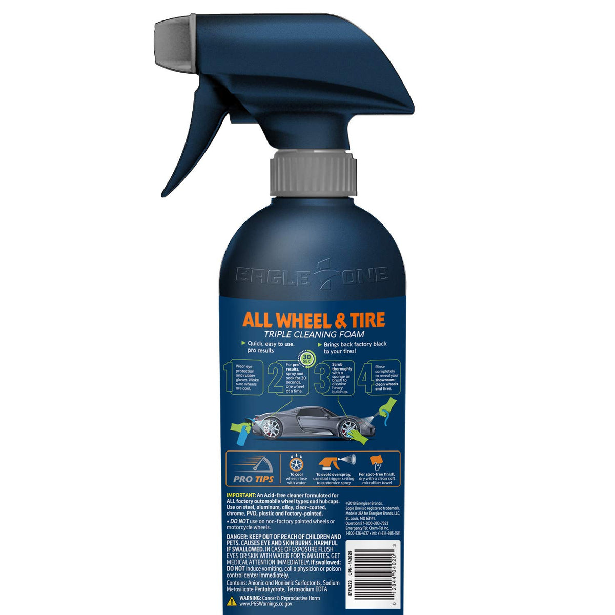 Eagle One is the #1 wheel cleaning brand for over a decade, any wheel, any tire, nothing cleans better. The Eagle One A2Z Wheel & Tire Cleaner features a powerful 2-in-1 formula. It clings to the surface of ANY wheel or tire to safely and easily remove brake dust, grime and grease. The thick acid-free foam is safe for any type of wheel, hubcap or tire, making for a risk-free clean. No scrub formula with alkaline builders pulls dirt and grime from the surface of wheels and tires, breaking up tough deposits without agitation. Additional uses include a pre-wash on the lower section of your vehicle and wheel wells and even works well as an engine degreaser. Featuring a new easy-to-use hose sprayer, just attach, spray, rinse and repeat for more washes than ever before.