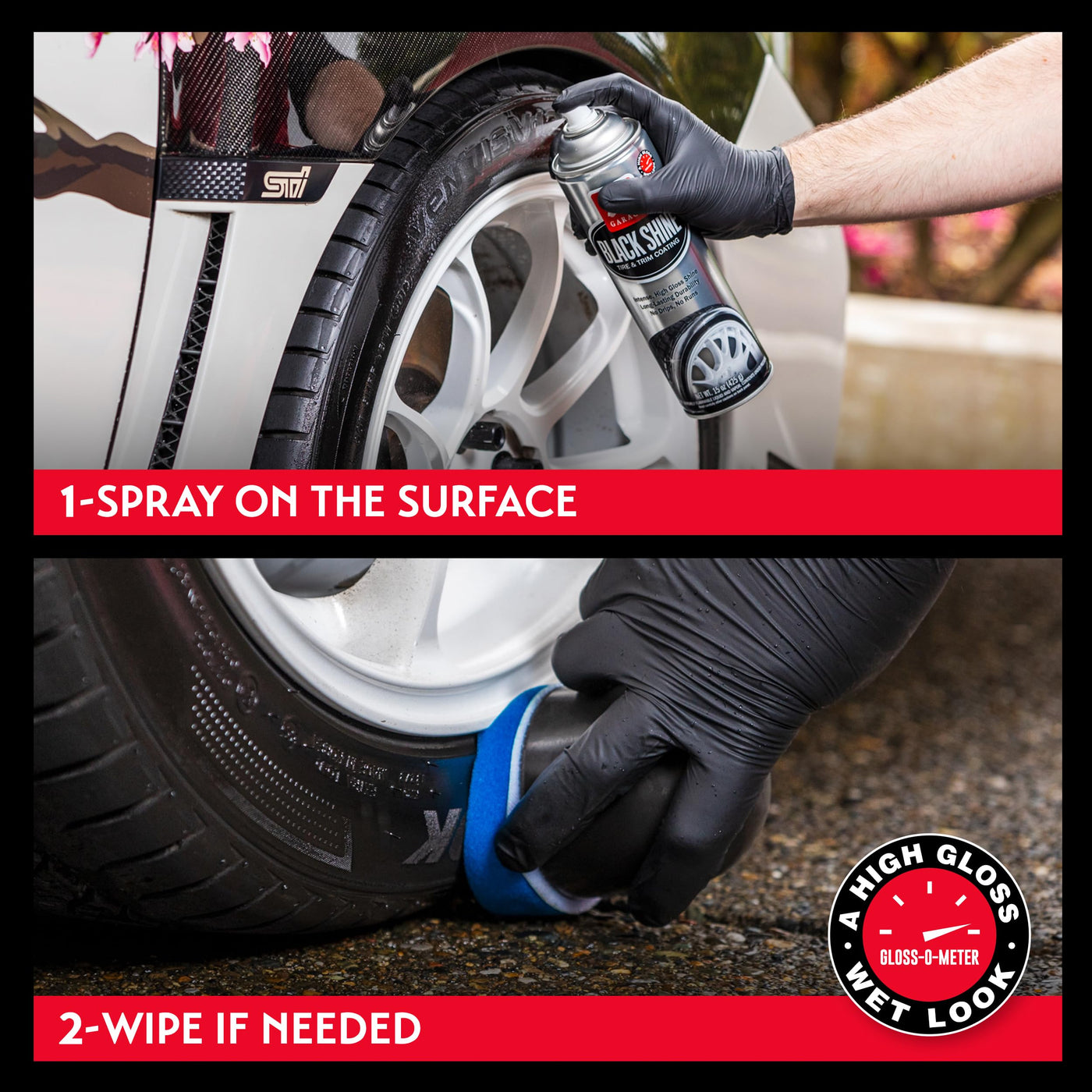 Deepen the darkness and bump the brilliance of your tires and trim with Griot's Garage Black Shine. Our water resistant formula provides extended durability against rain and multiple car washes. We designed the can to produce a precise spray pattern which means minimal over-spray and smooth, even application on tires, trim, and wheel wells.