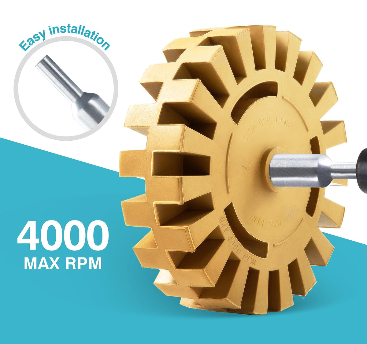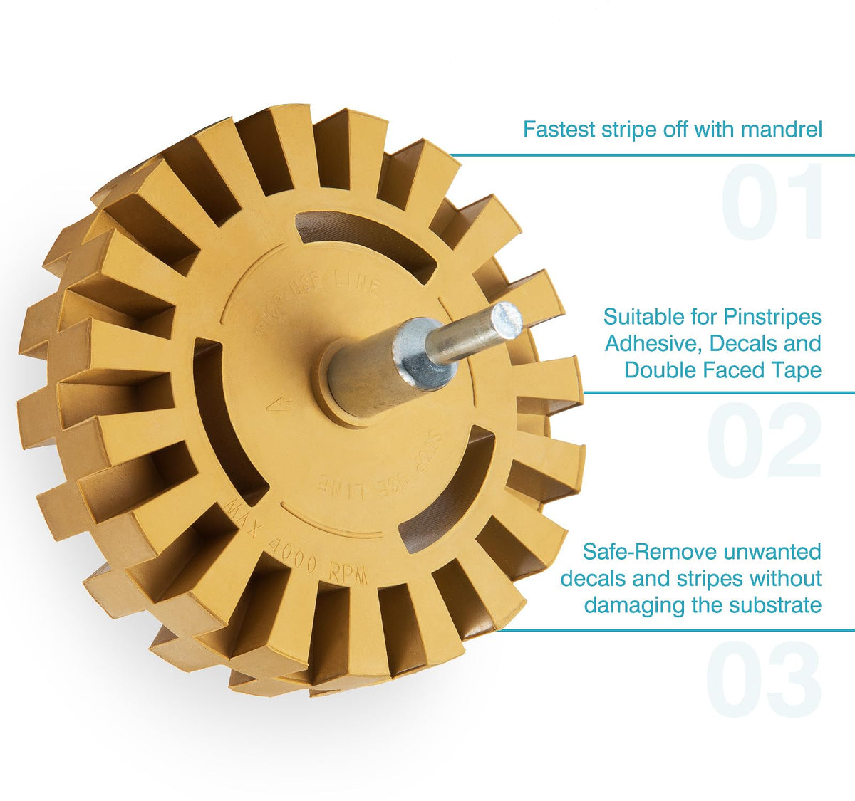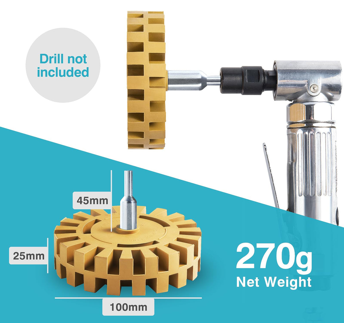 4 Inch Double Sided Adhesive Graphics Removal Tool Rubber Eraser Wheel for DrillVariety of uses: Effective removal of auto body vinyl decals, pinstripes and pinstriping, bumpers stickers and other adhesives from cars, boats, RVs, trucks, trailers, buses, bikes, motorcycles, appliances and more. Great to use on multiple Paint, chrome, and metal surfaces.Money saving: There is no need to purchase extra expensive power tools as this decal eraser wheel will fit any home drill. The decal remover wheel will also save money by avoiding the cost of stripping and replacing paint to remove decals, striping, And stickers.Package Type: 1 Pack slotted decal eraser wheel with 1 adapterMaterial: Soft rubber Size: 4 inchItem Weight:9.87 ounces How To Use?Step 1 - Attached the arbor to the rubber wheel and tighten it, Put the rubber eraser on your regular household drill.Step 2 - Start by washing the area with water and soap to remove dirt, grease, etc.Step 3 - Apply light pressure starting at the top of the decal and moving side to side, or for faster results, use the entire width of the wheel without tilting or angling. Remove any residue with an appropriate mild solvent.Note: 1?Please use the corresponding speed according to the year of your cars. 2?Please use the correct speed and pressure according to the thickness of the glue. 3?We cannot guarantee that this product can remove any types of residual adhesive.